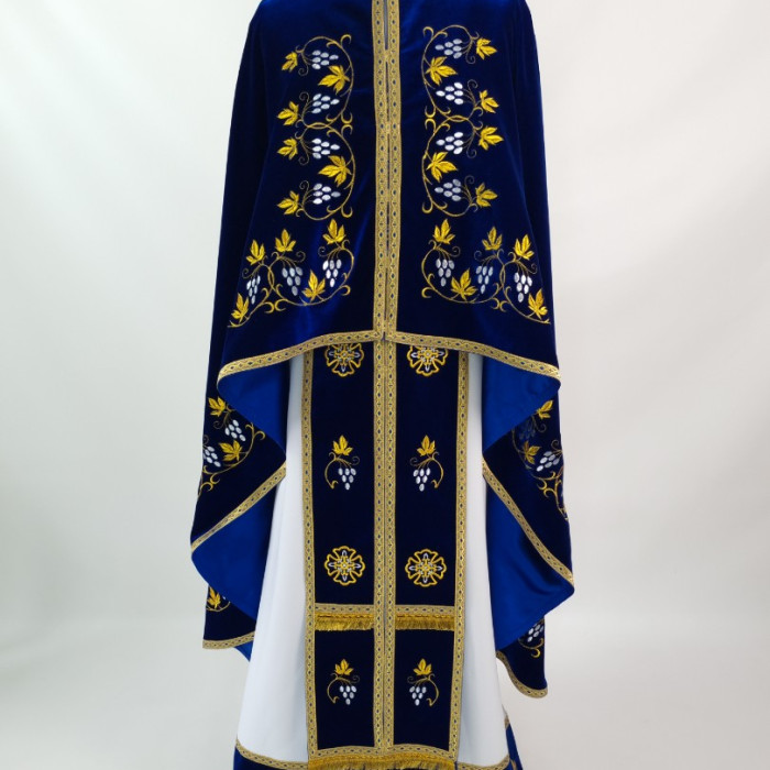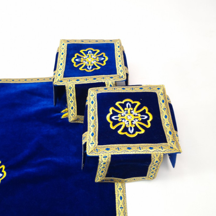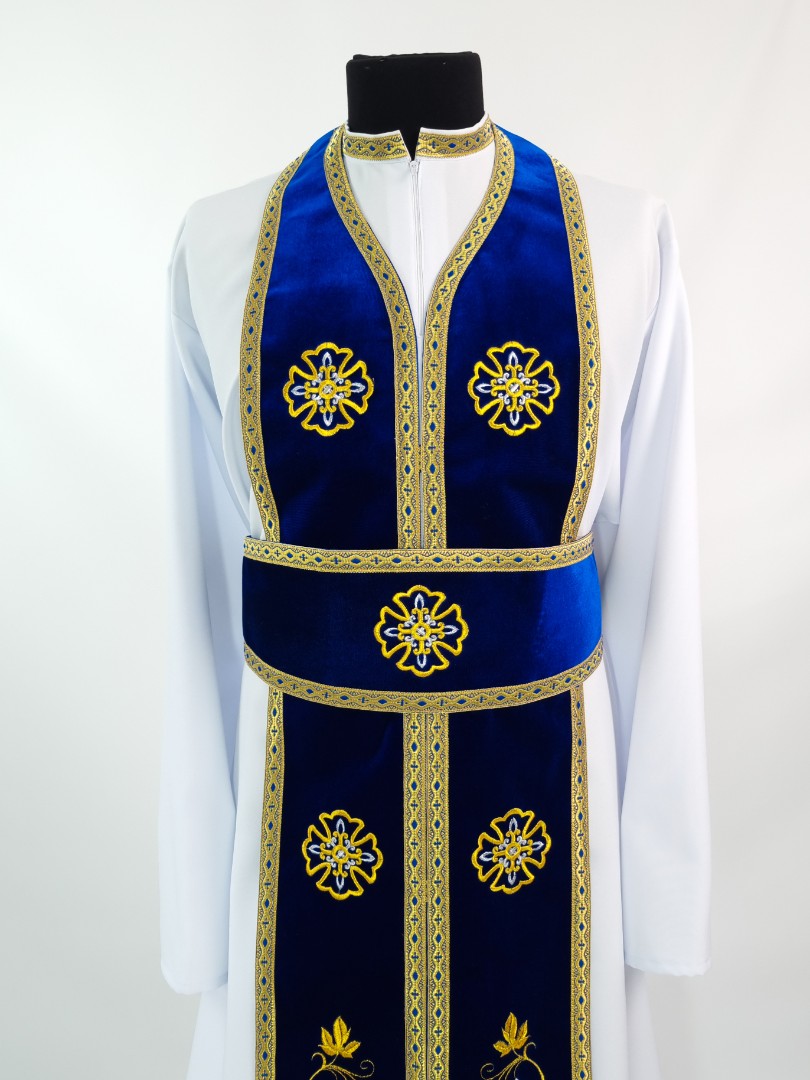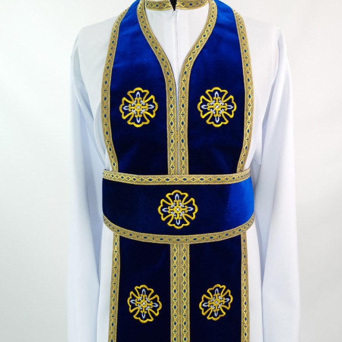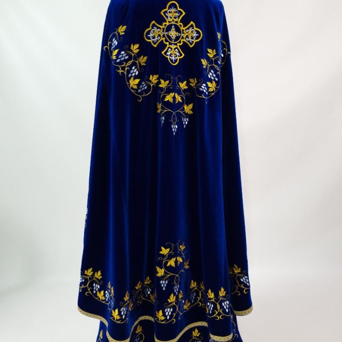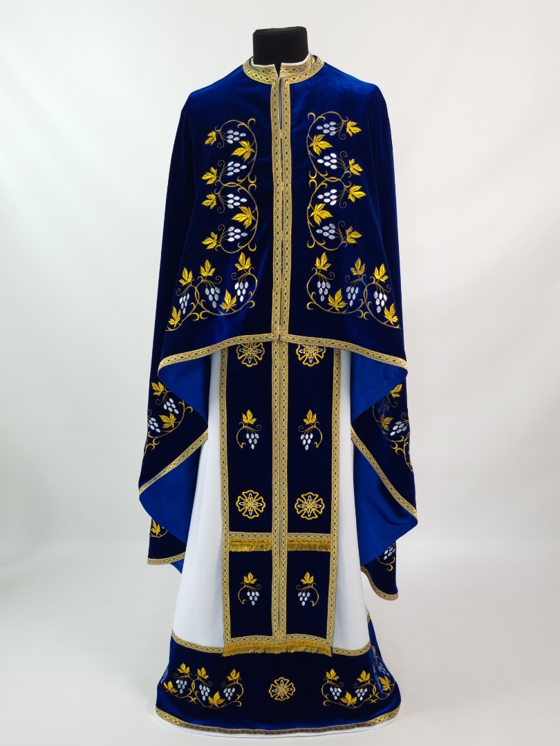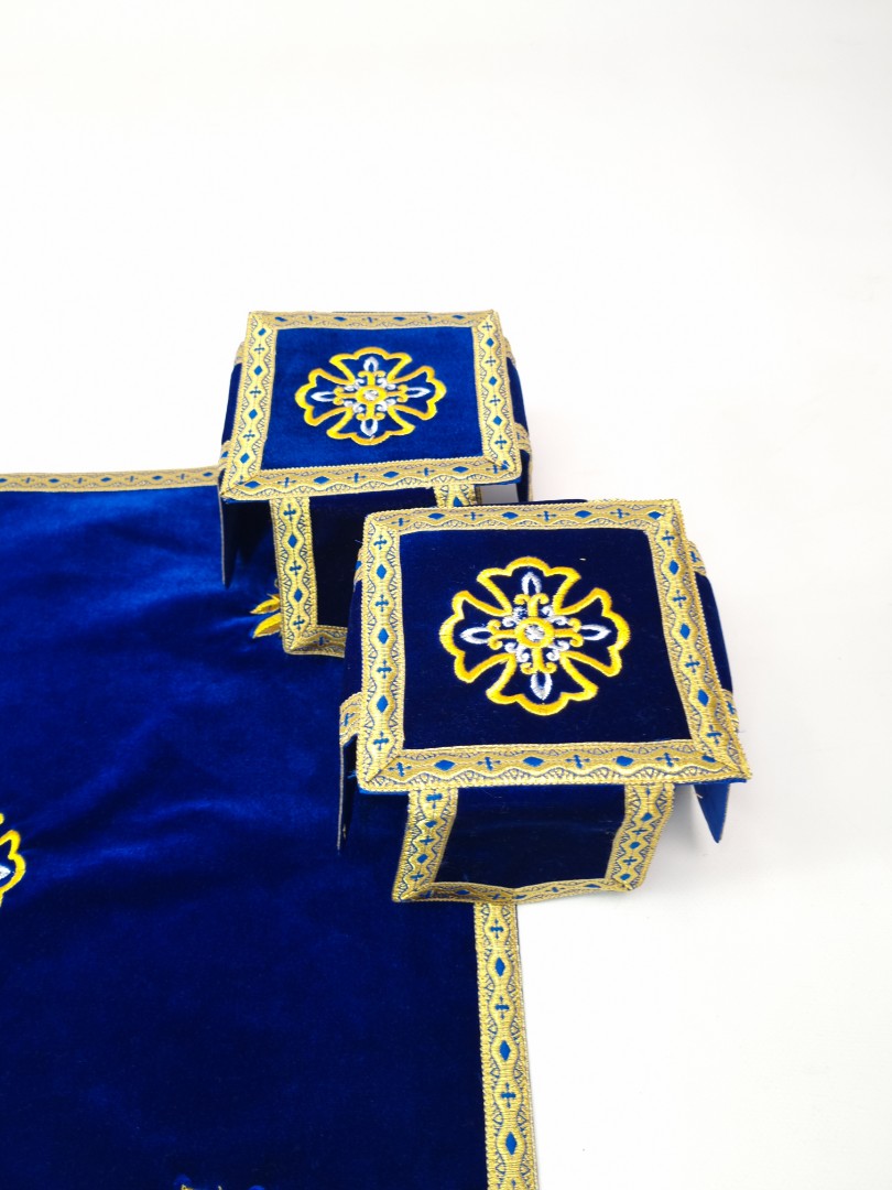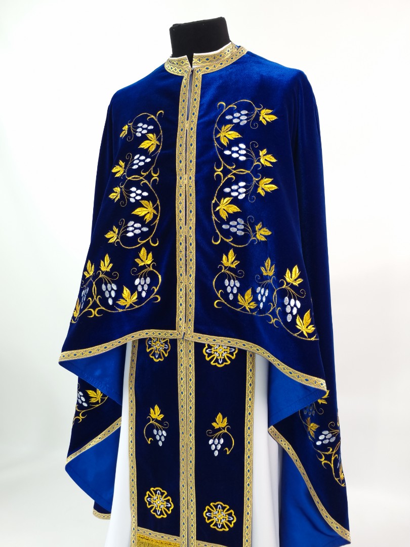 - Вбрання для священиків пошито з велюру синього кольору з золотими та срібними декоративними елементами (бахрома, кромка, орнамент).
