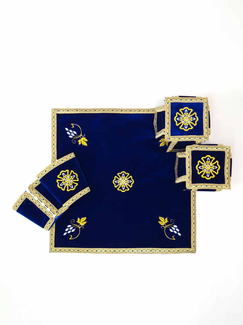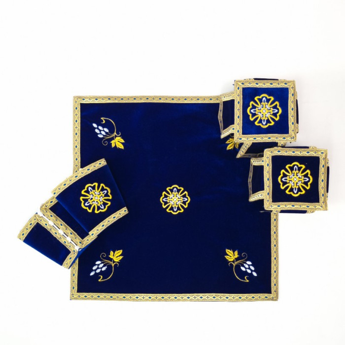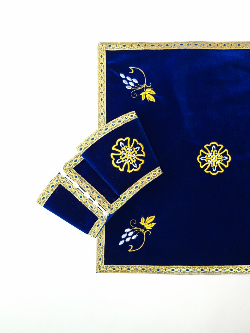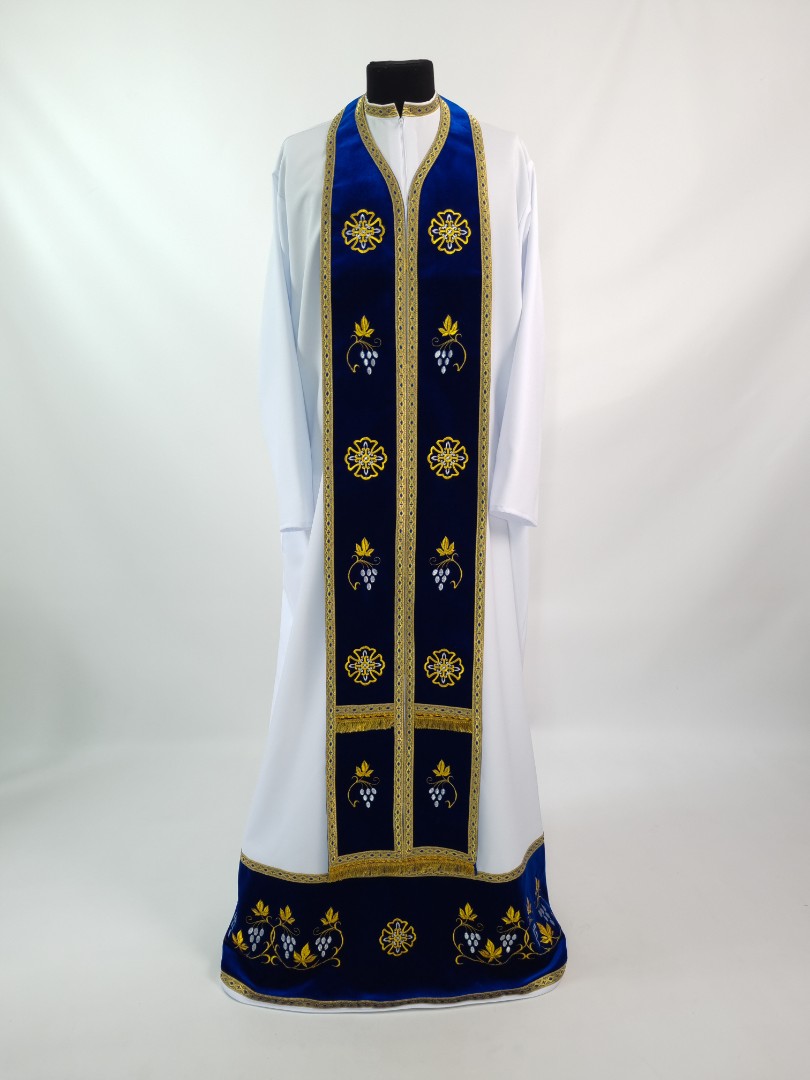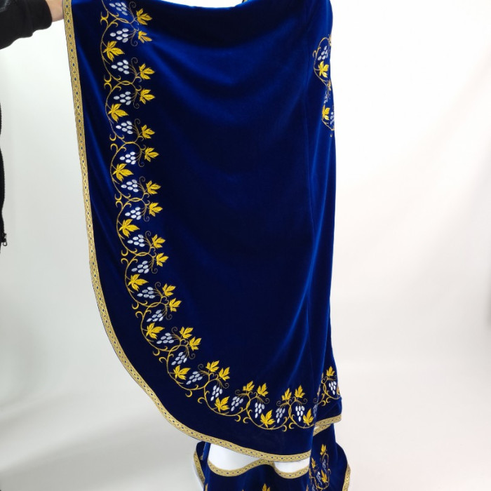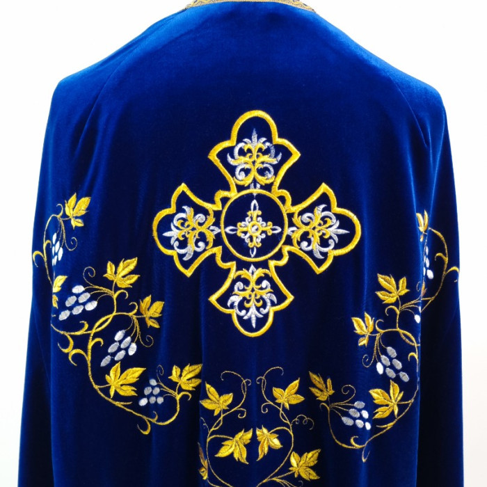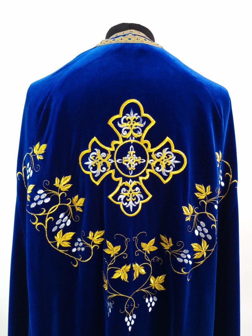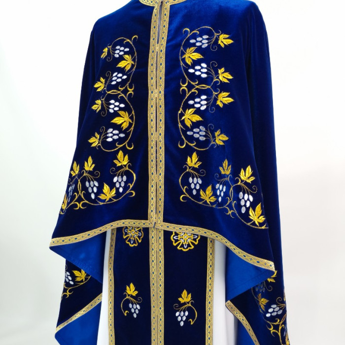 - Вбрання для священиків пошито з велюру синього кольору з золотими та срібними декоративними елементами (бахрома, кромка, орнамент).