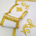 - Рослинний мотив в золотій гамі доповнюється такою ж широкою кромкою по краях і бахромою по низу.