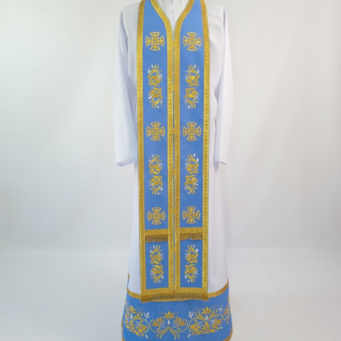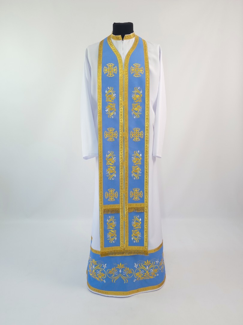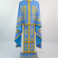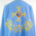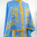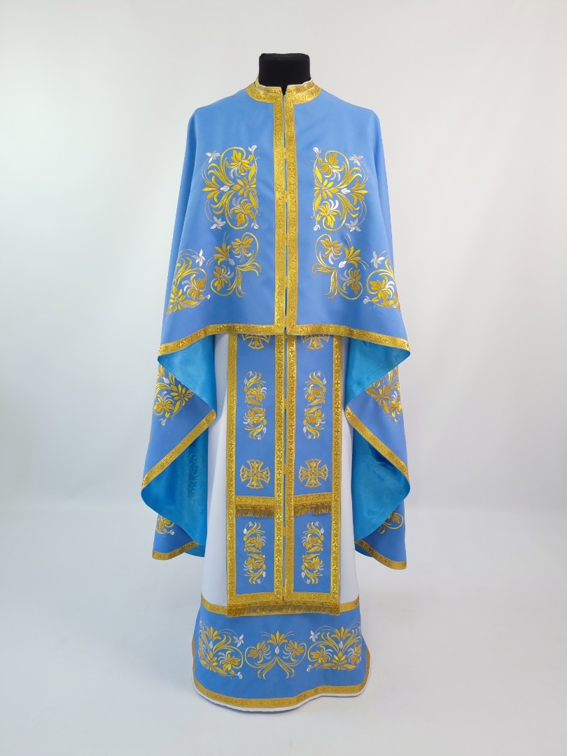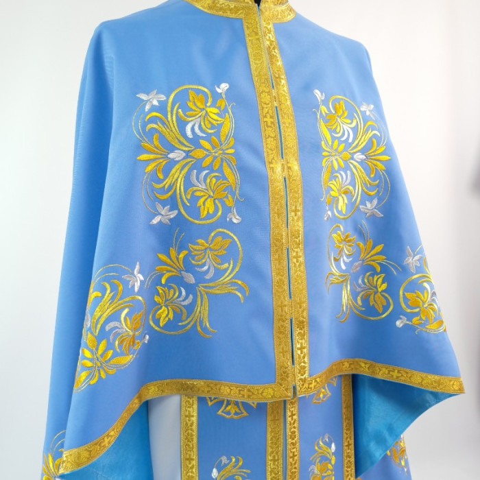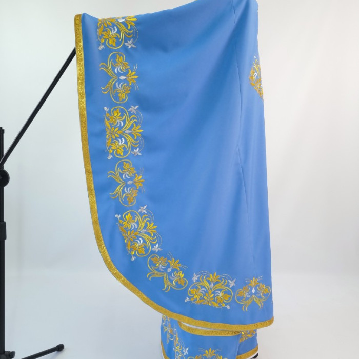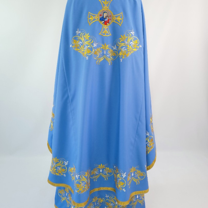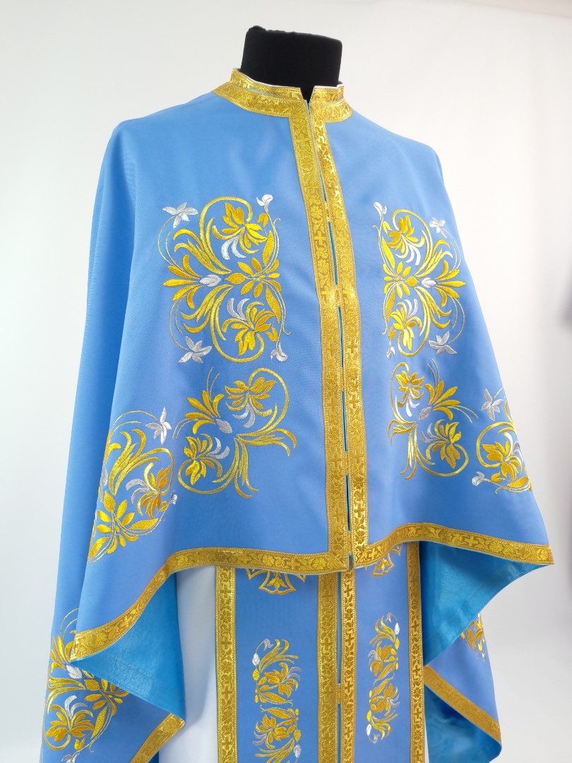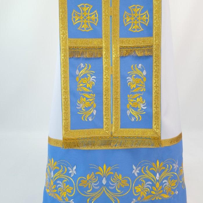 Наш блакитний фелон Ф 42 - це втілення елегантності і духовності. Виготовлений з високоякісного габардину в блакитних тонах з білими стихарем. Весь виріб прикрашений чудовою машинною вишивкою, виконаною люрексовими золотистими, срібними та білими нитками. Вишиті мотиви включають великі та малі хрести, рослинний орнамент та бахрому.
