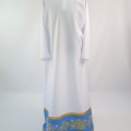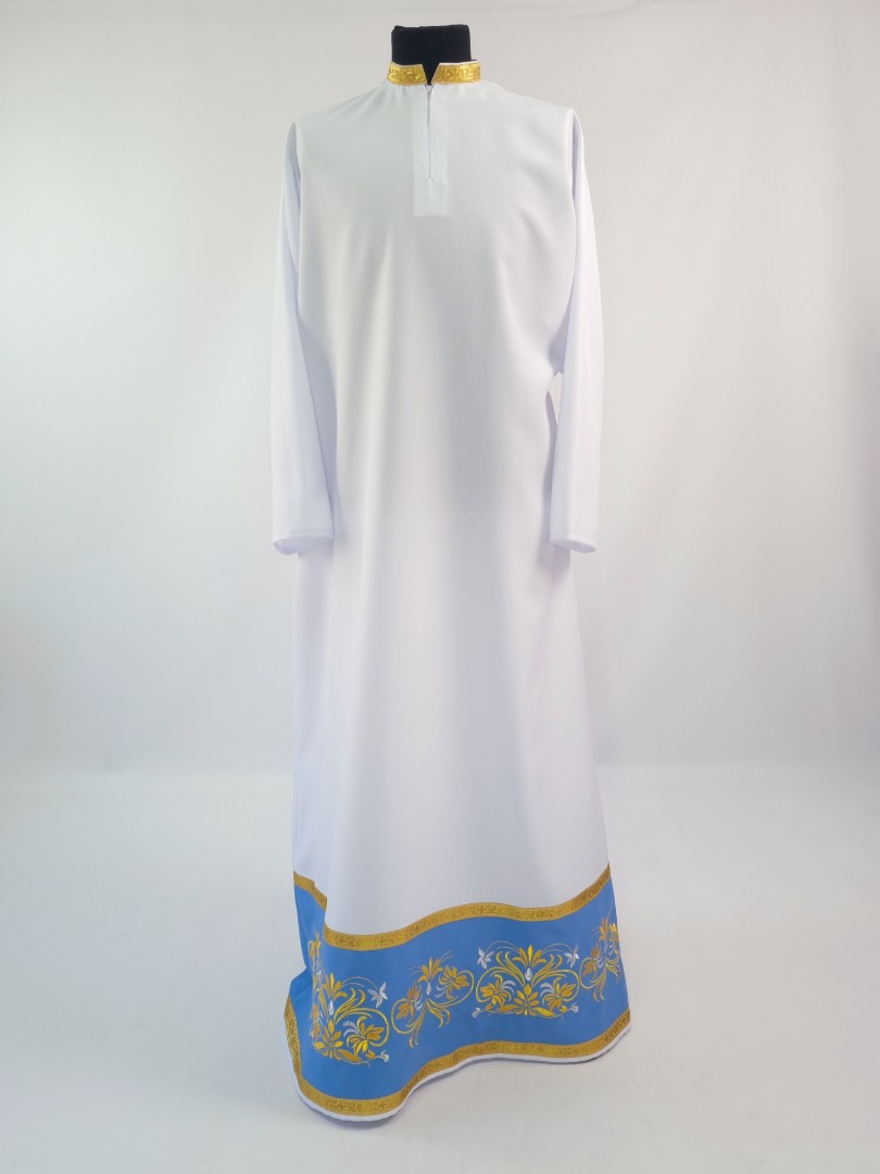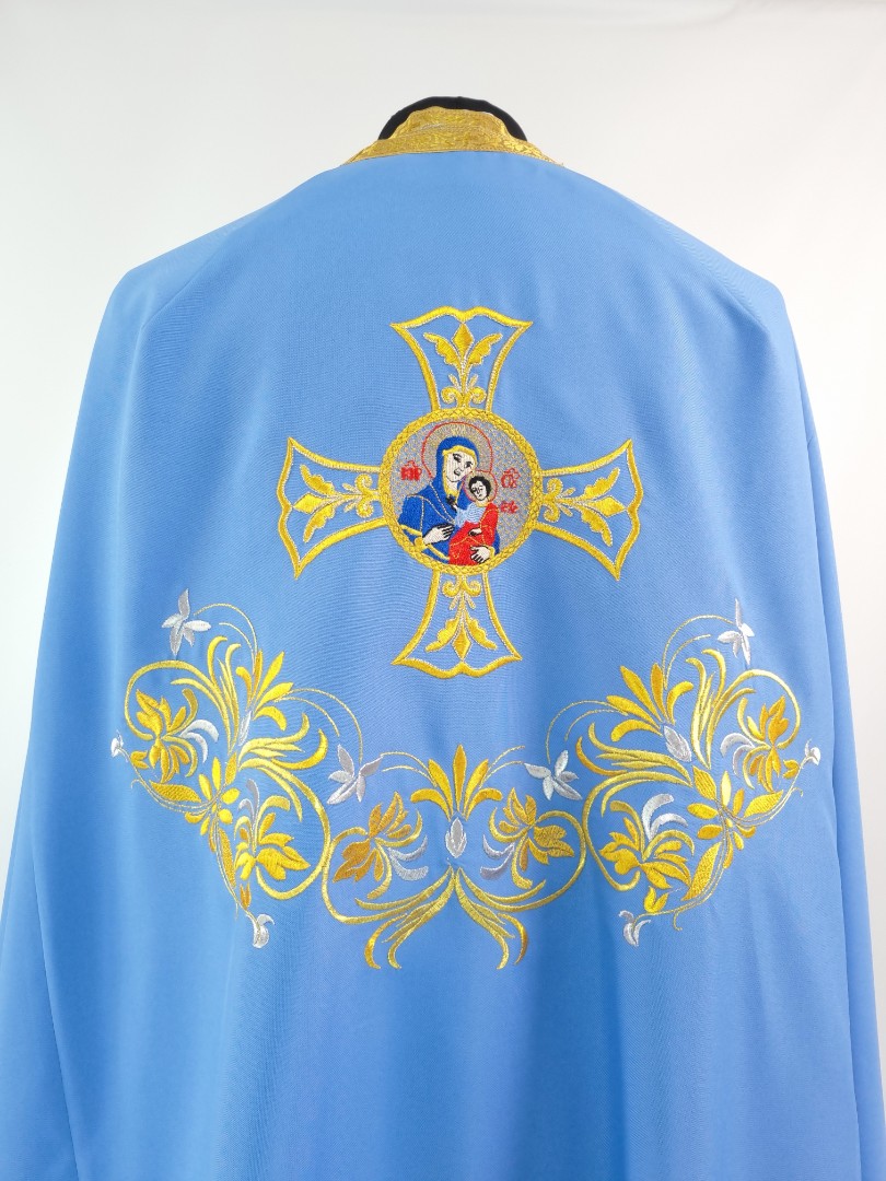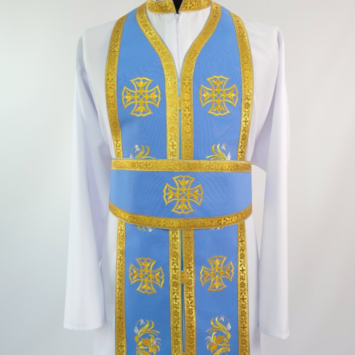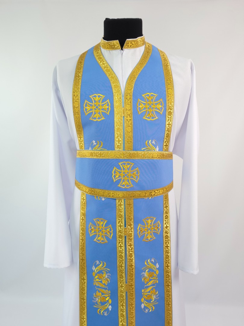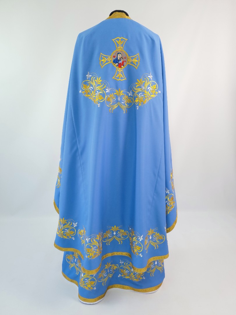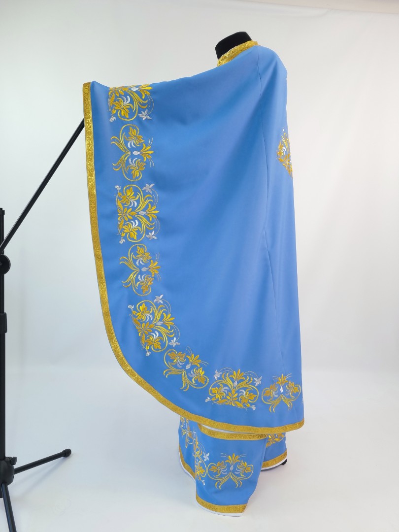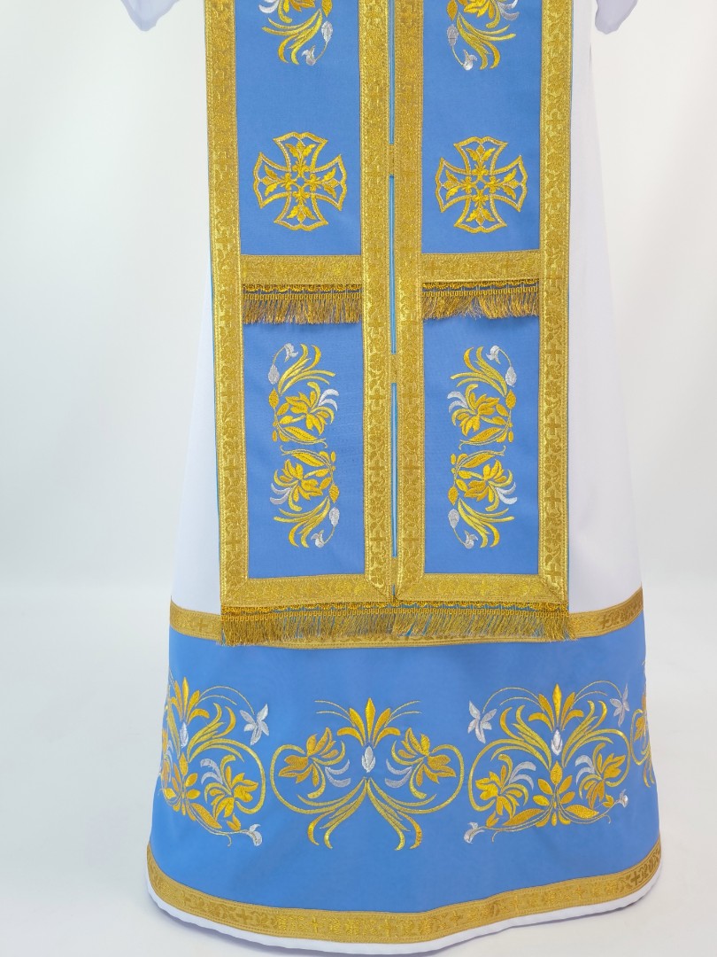Наш блакитний фелон Ф 42 - це втілення елегантності і духовності. Виготовлений з високоякісного габардину в блакитних тонах з білими стихарем. Весь виріб прикрашений чудовою машинною вишивкою, виконаною люрексовими золотистими, срібними та білими нитками. Вишиті мотиви включають великі та малі хрести, рослинний орнамент та бахрому.