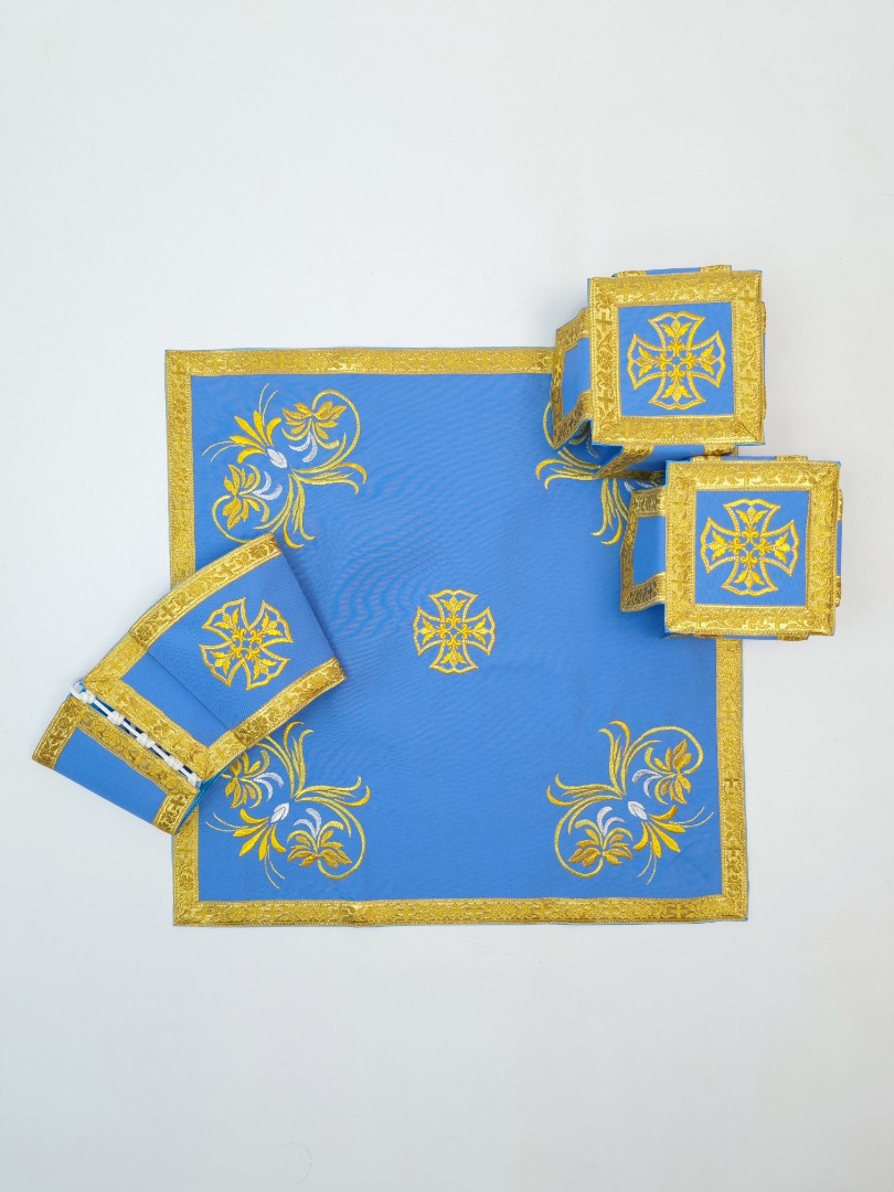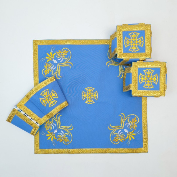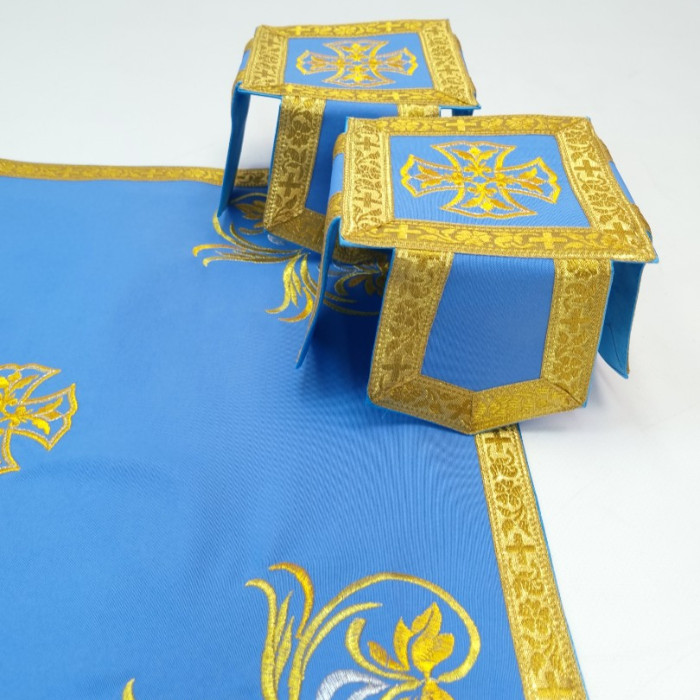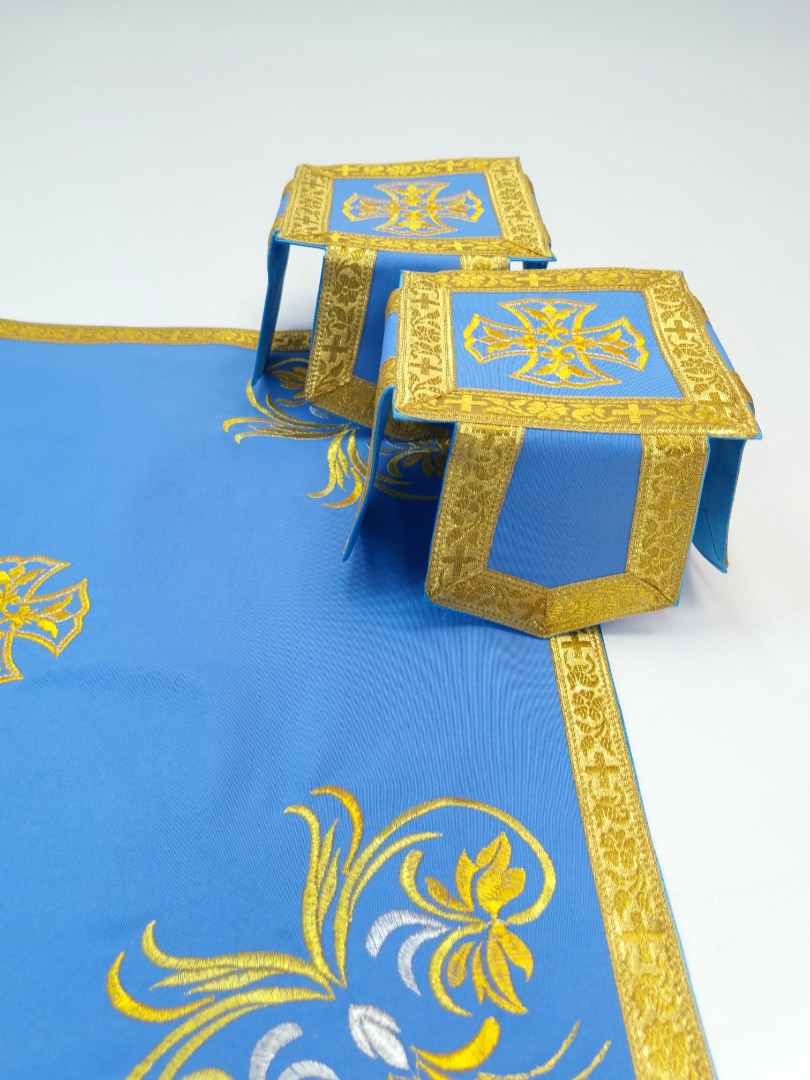 У комплекті йде вся потрібна літургійна атрибутика - покрив, пояс, стихар, епітрахиль, повітря, нарукавники, покрівці все витримано в тому ж стилі і палітрі.