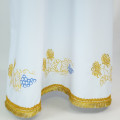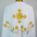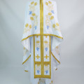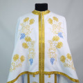 - Вишитий фелон, купити який пропонується за доступною ціною, має широку золотисту кромку і рослинний візерунок в синьо-золотій гамі.
