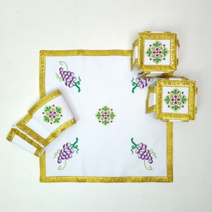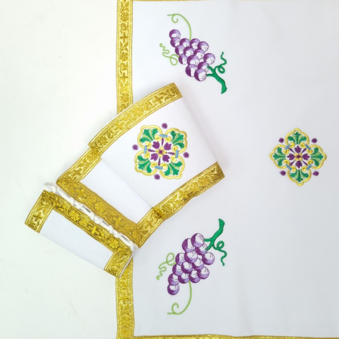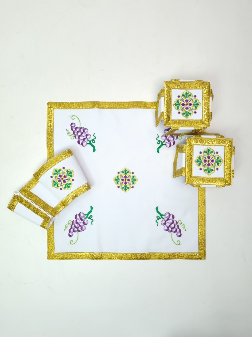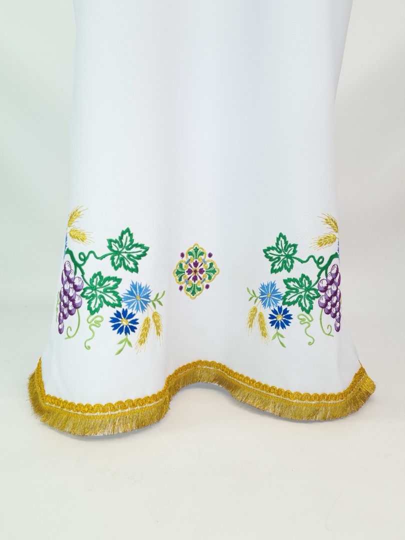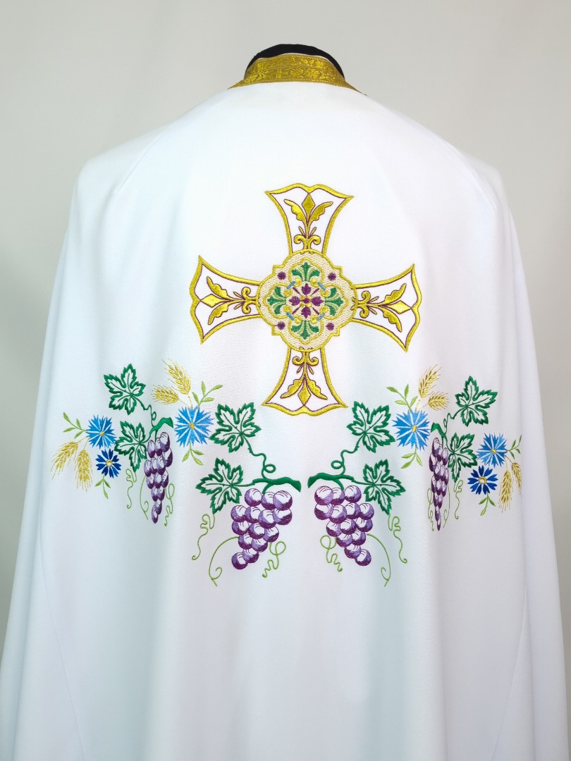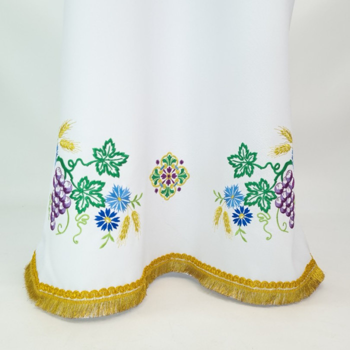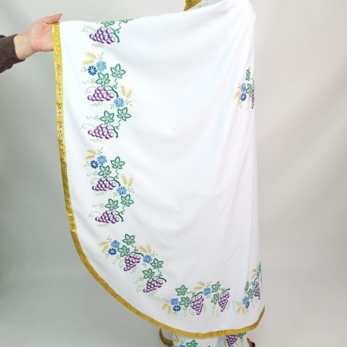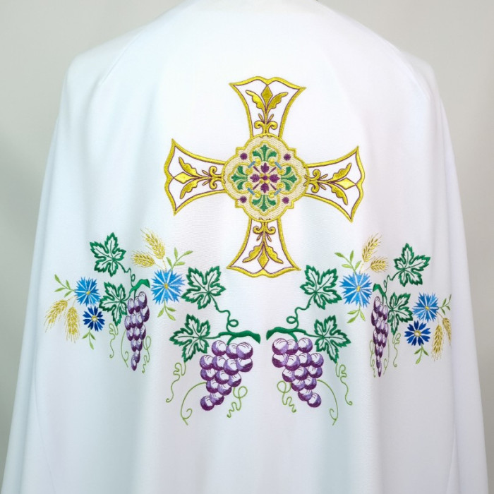 - Поверхня фелона декорована машинною вишивкою у вигляді композиції з виноградних грон, листя, волошок і пшеничних колосків.