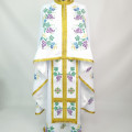 - Вбрання для священнослужителя прикрашено золотистою широкою кромкою, такою ж бахромою і мереживами.