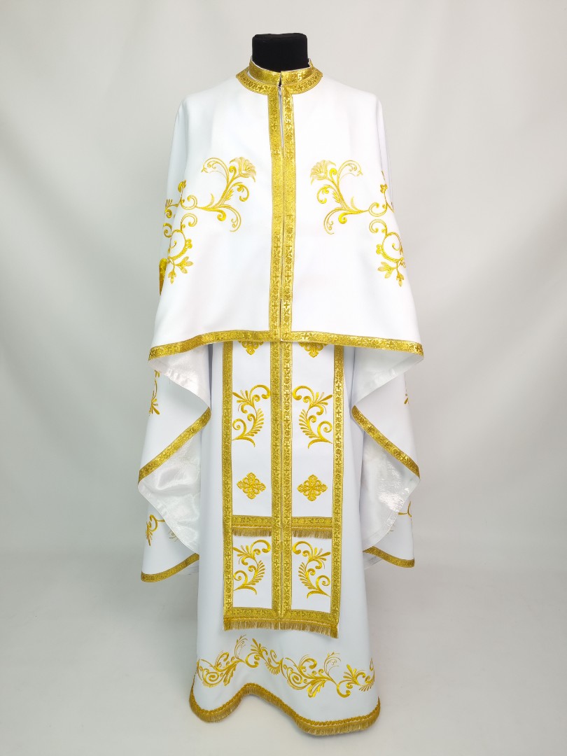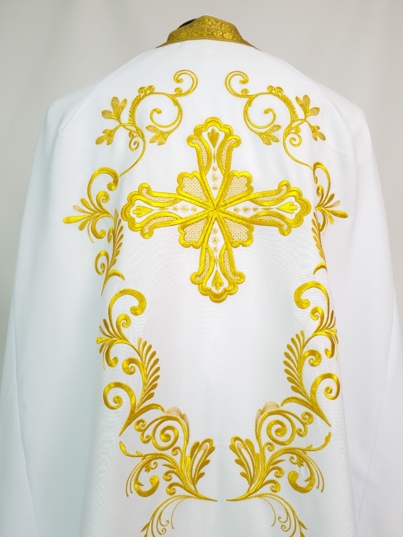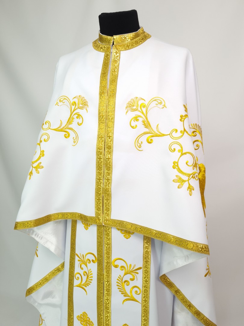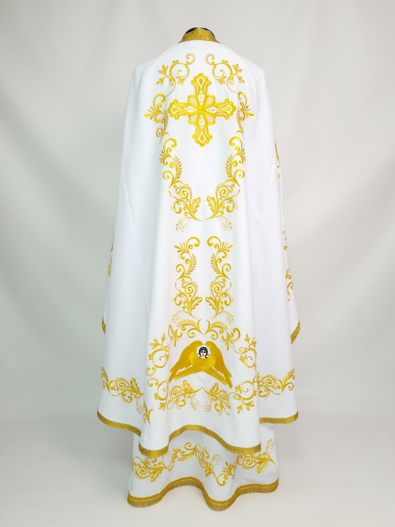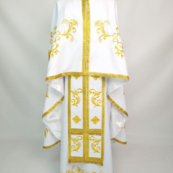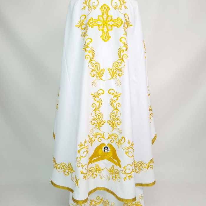 - Фелон з білосніжного габардину прикрашений машинною вишивкою люрексовими нитками золотистого відтінку.