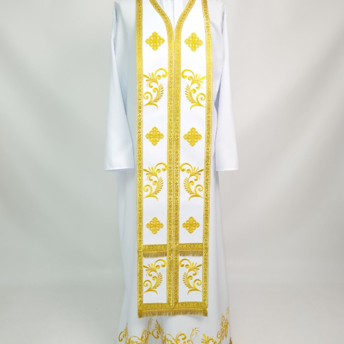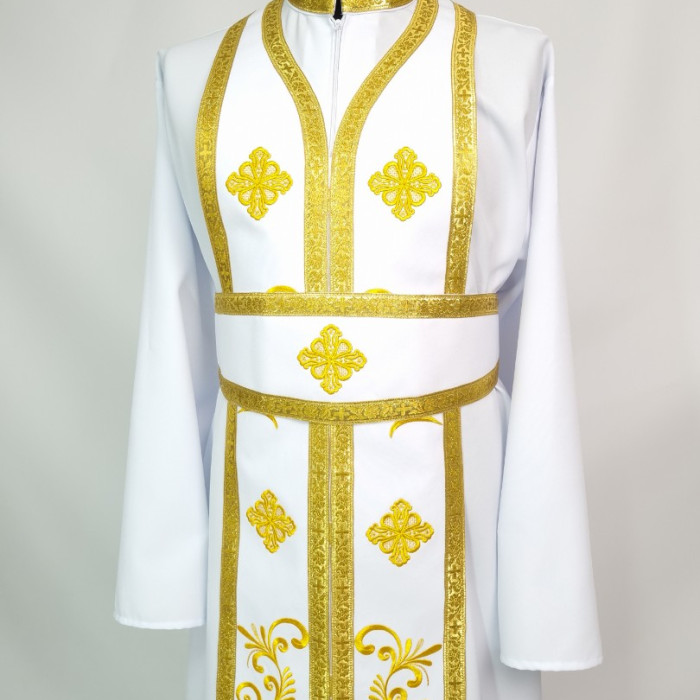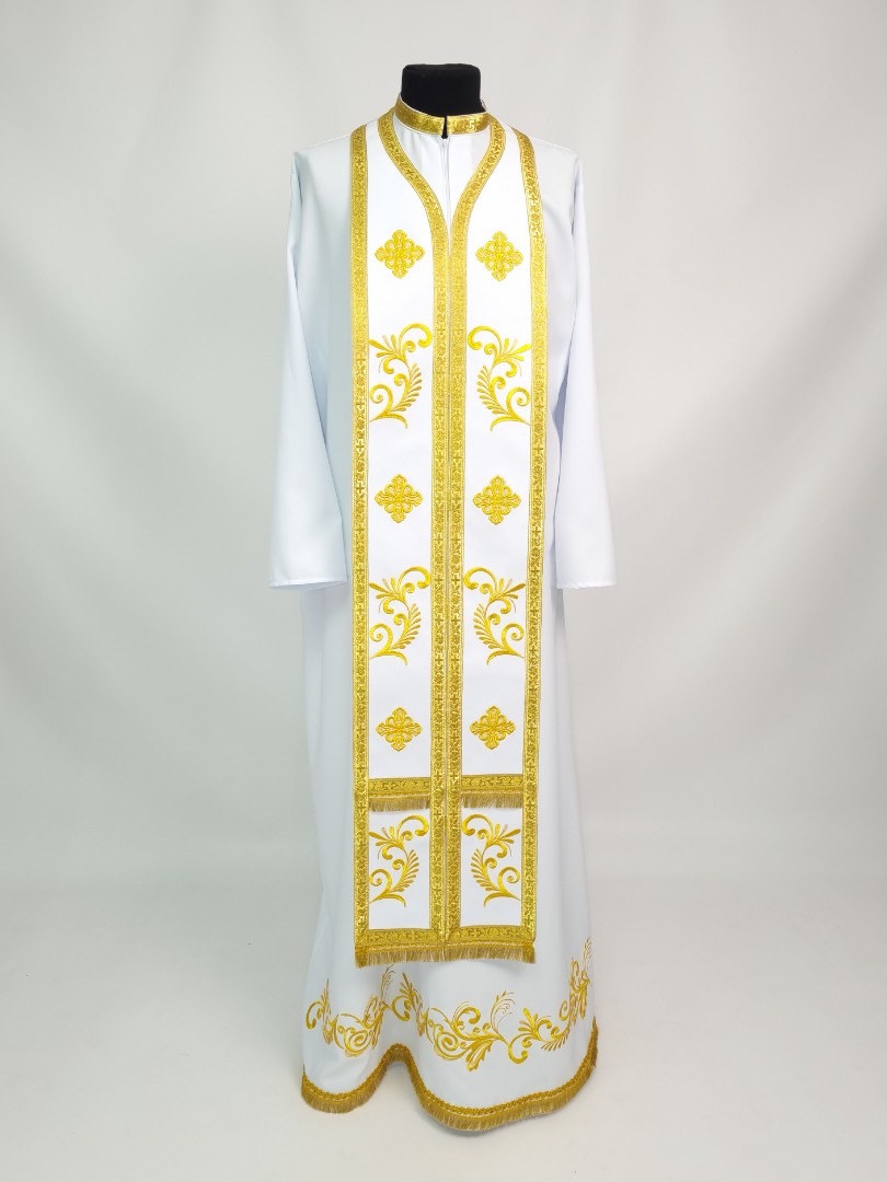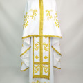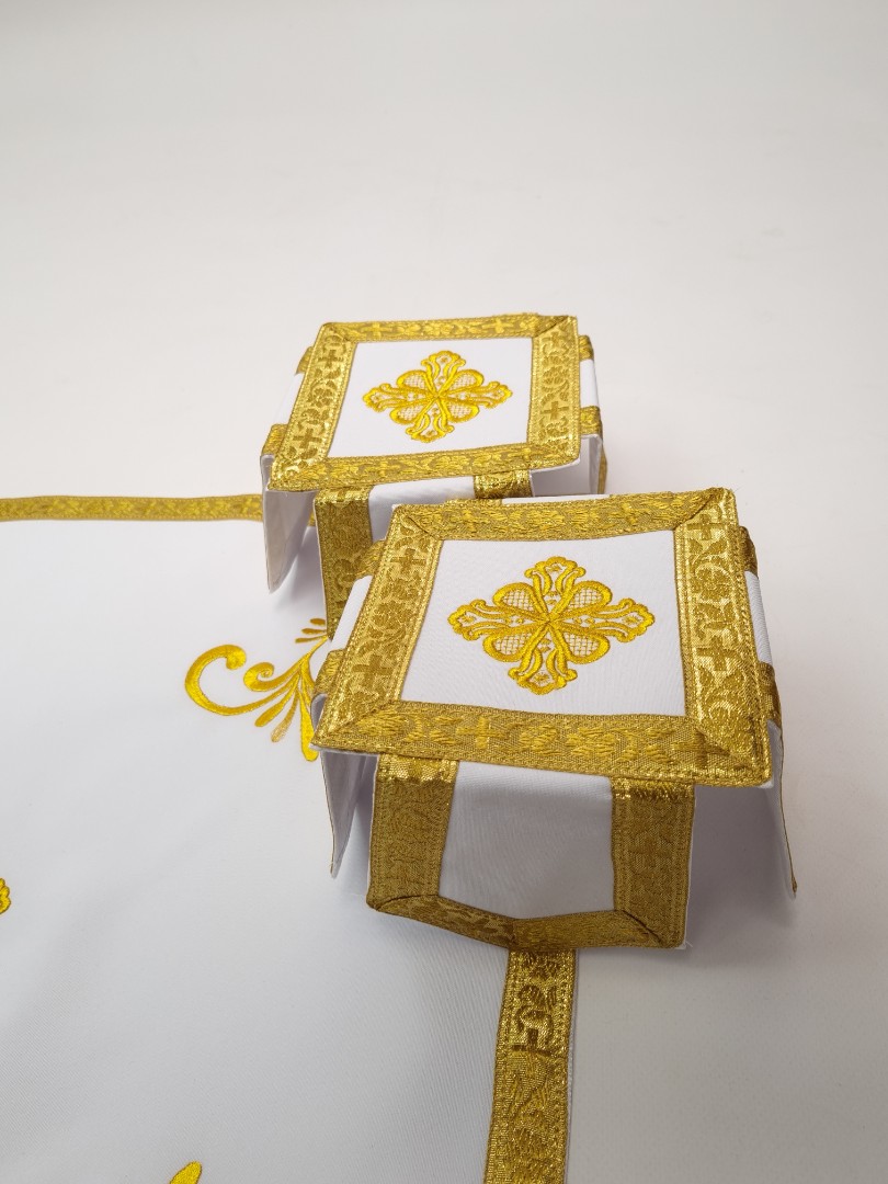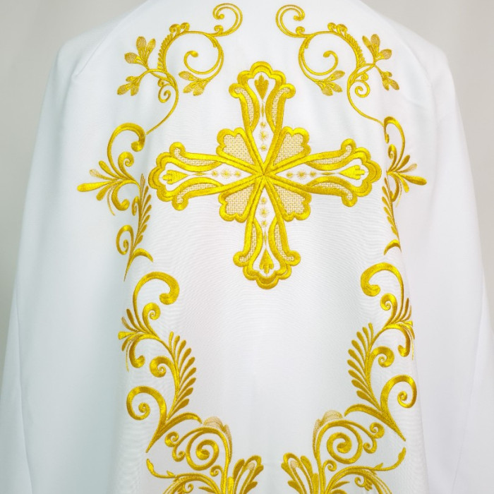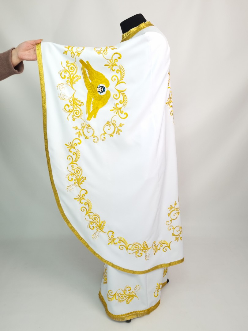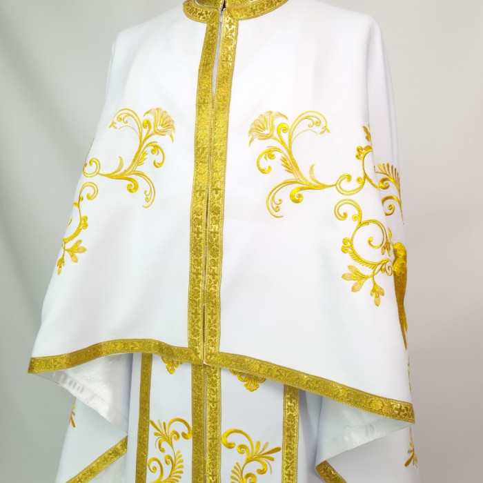 - Фелон з білосніжного габардину прикрашений машинною вишивкою люрексовими нитками золотистого відтінку.