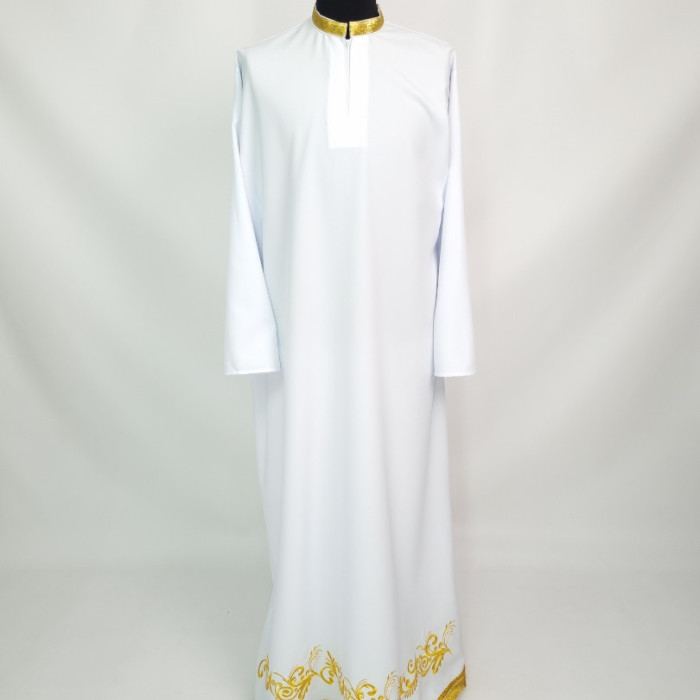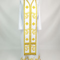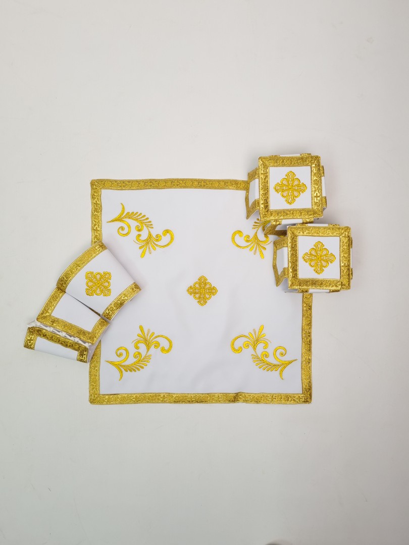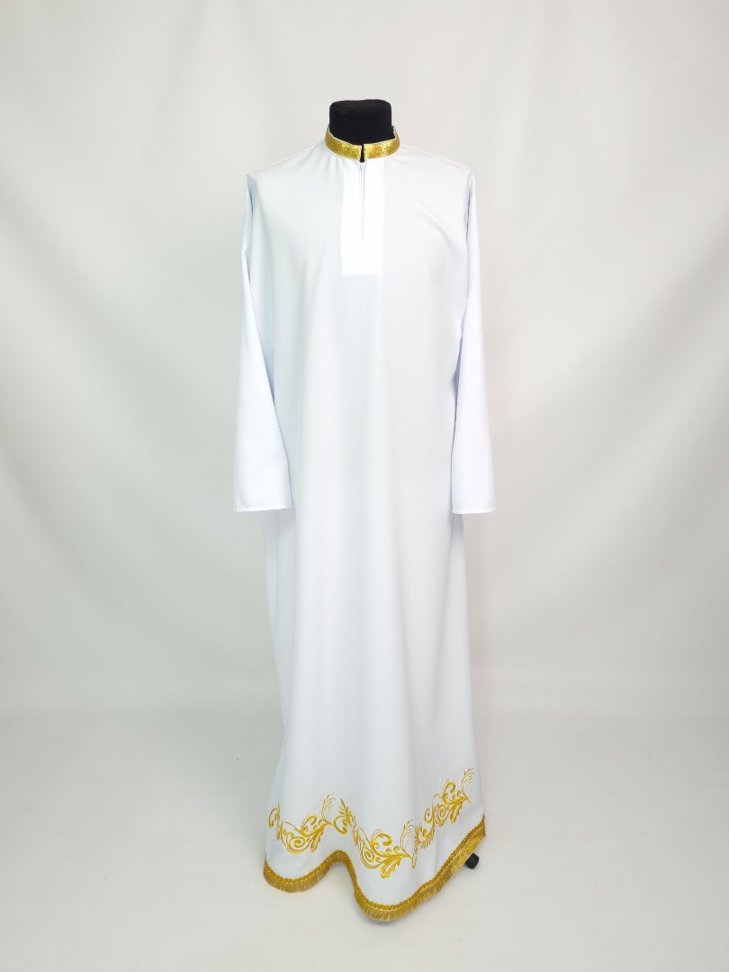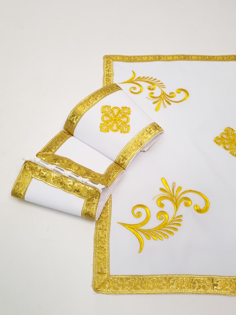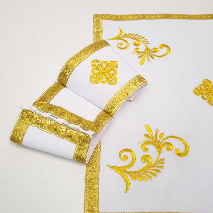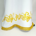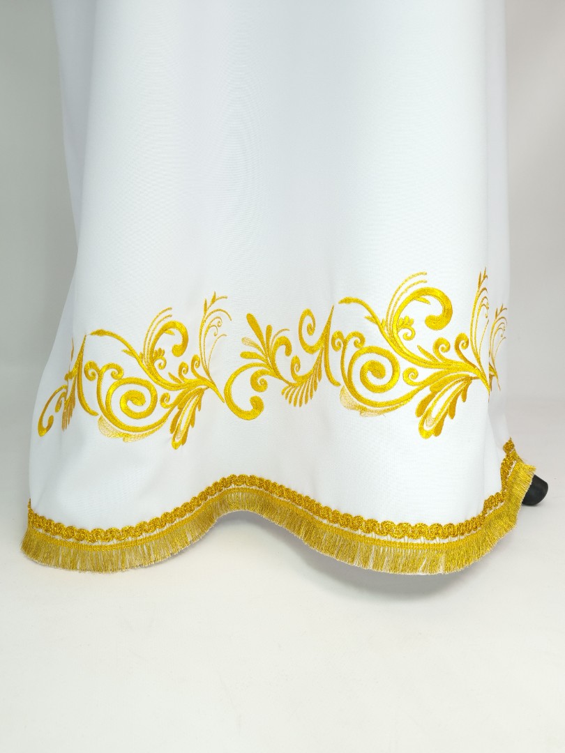 - Фелон з білосніжного габардину прикрашений машинною вишивкою люрексовими нитками золотистого відтінку.