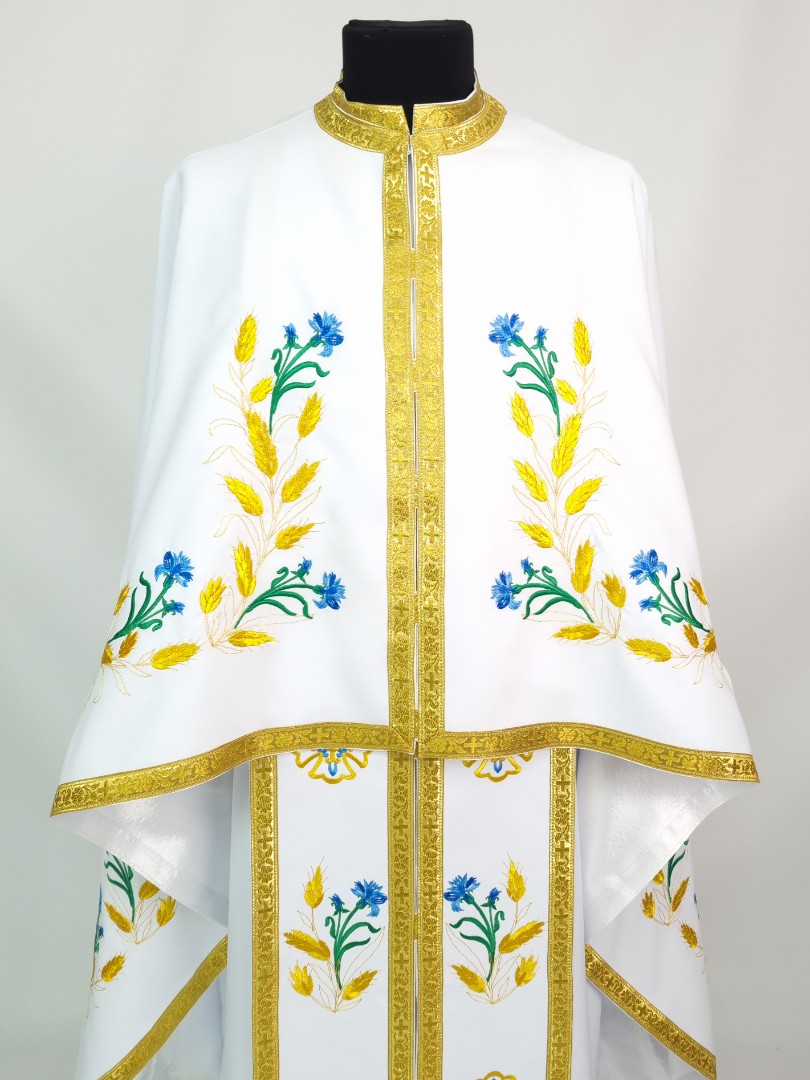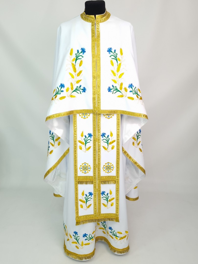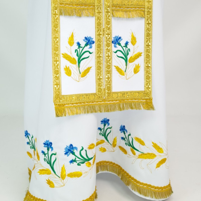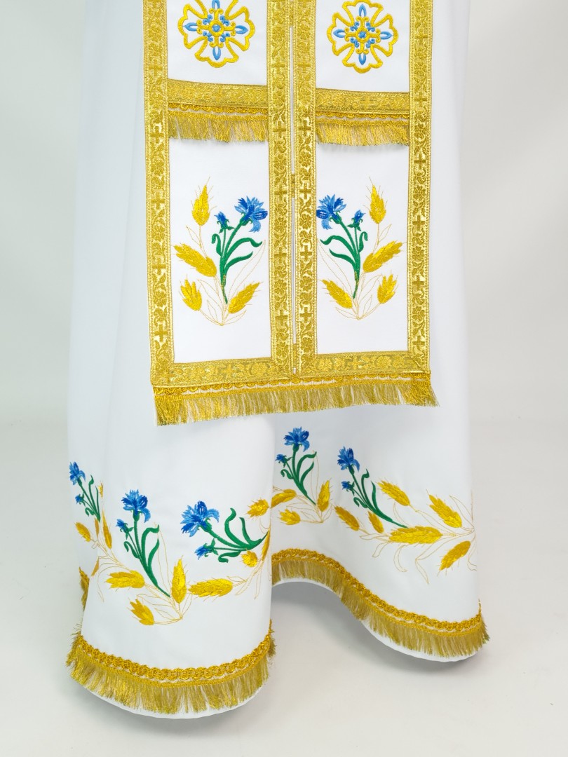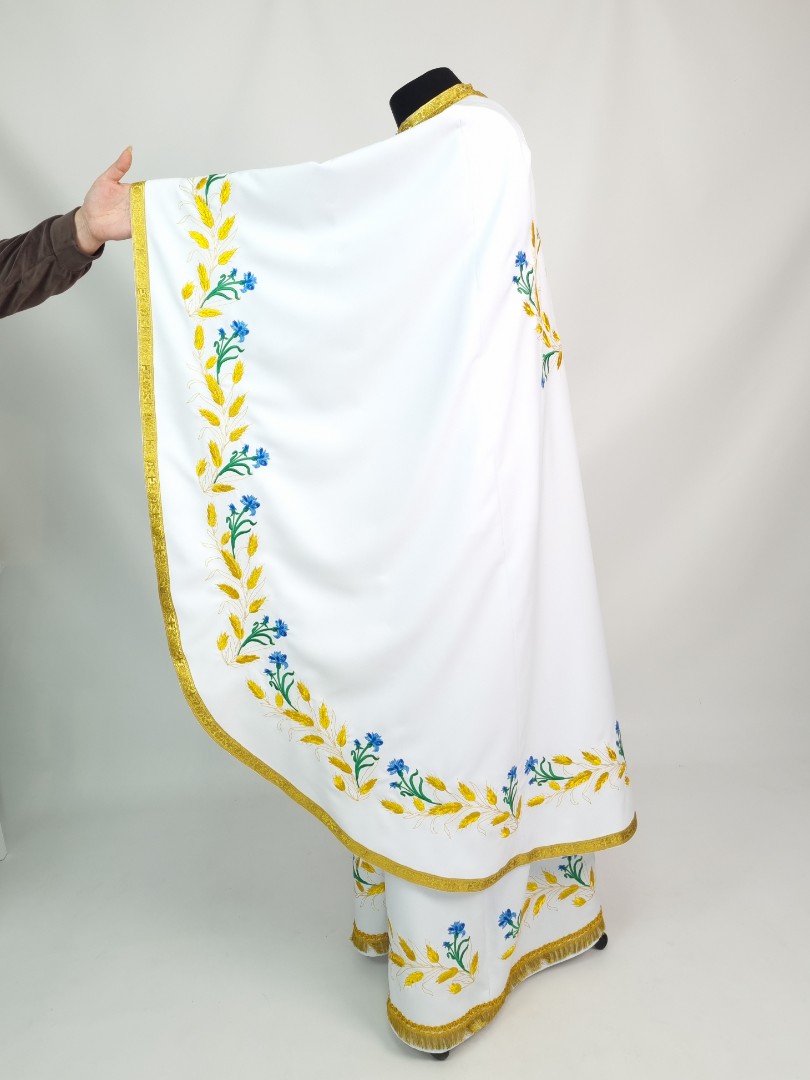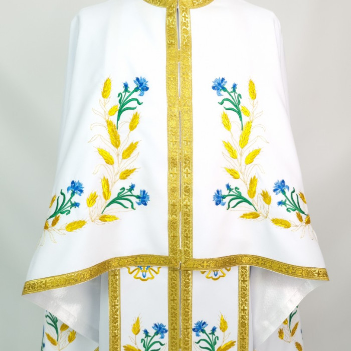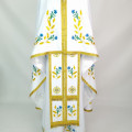 - Вишитий фелон від виробника витриманий в білому кольорі і прикрашений широкою золотою облямівкою по периметру.
