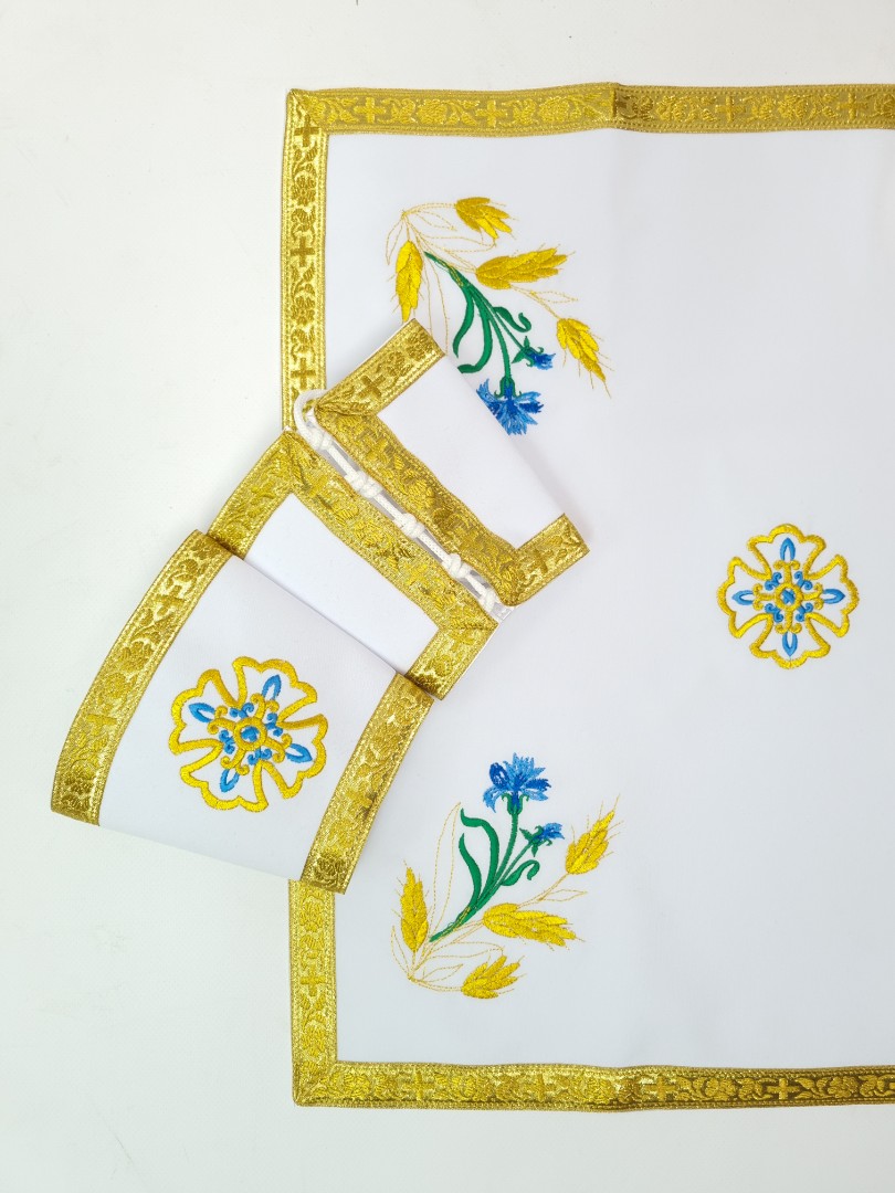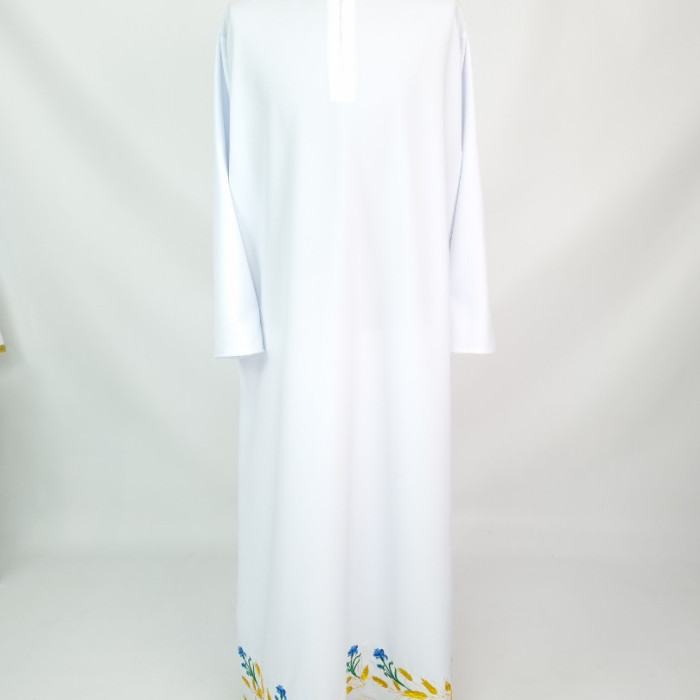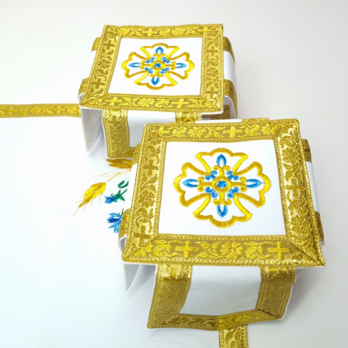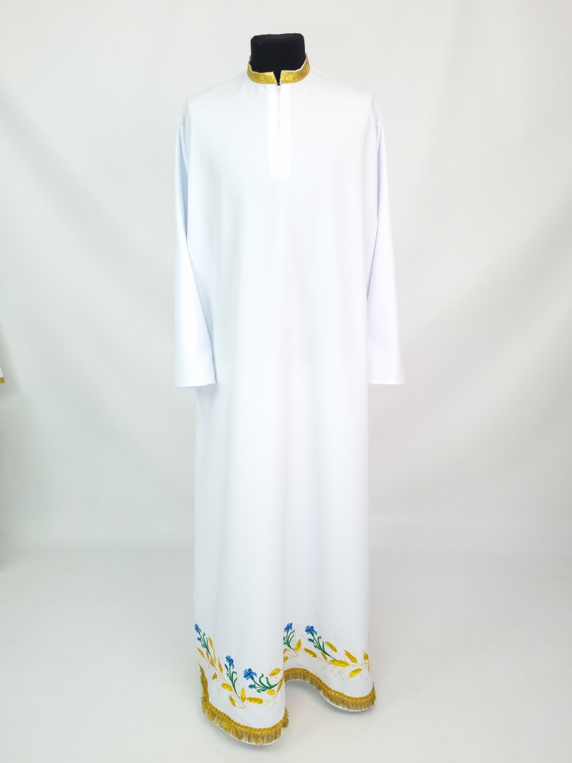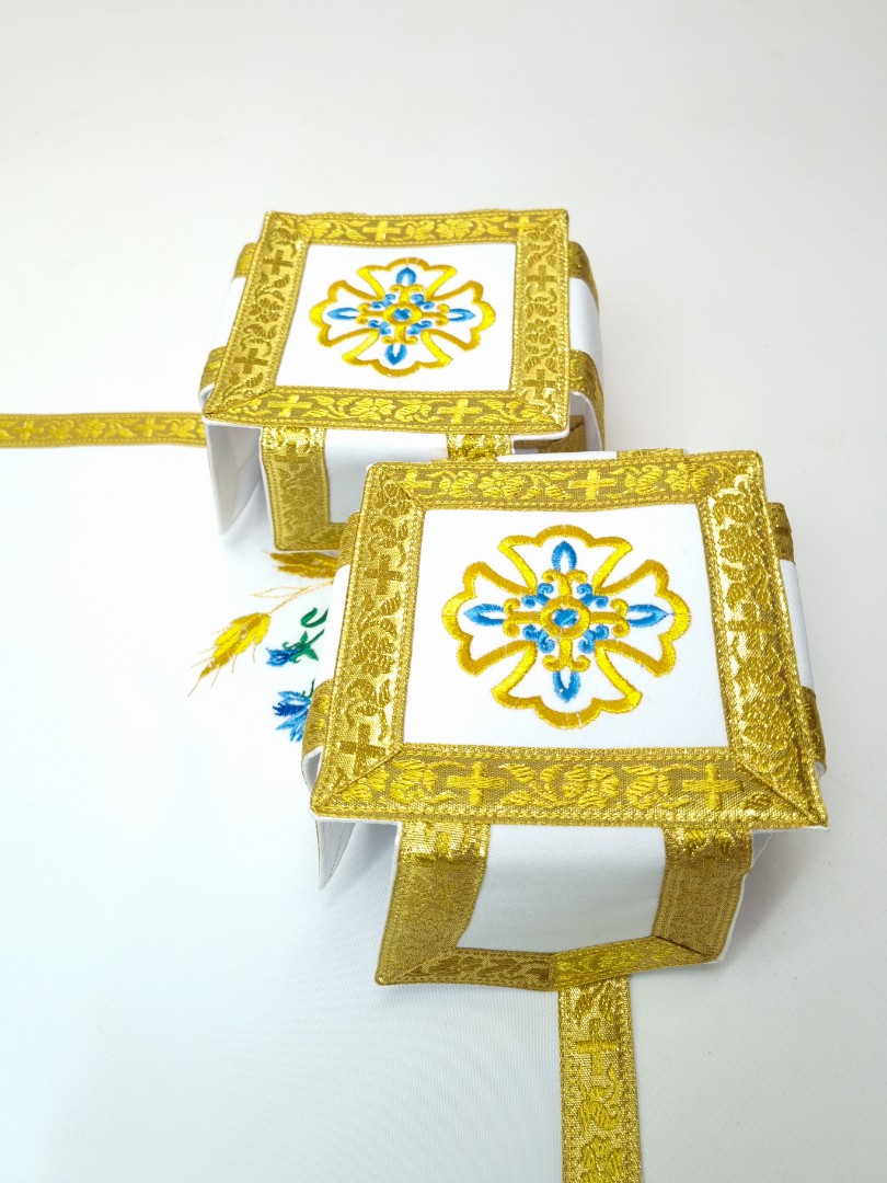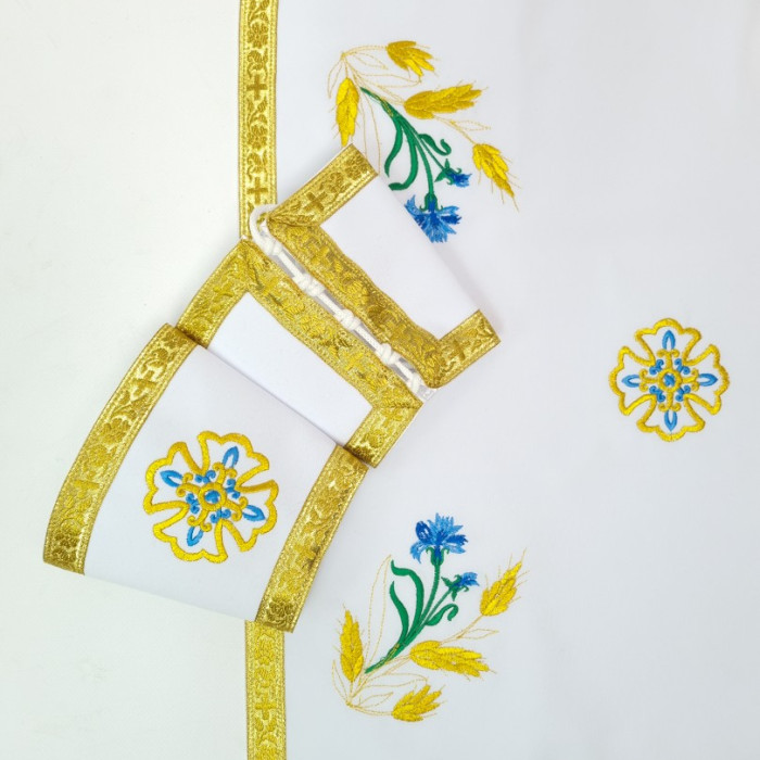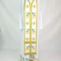 - Вишитий фелон від виробника витриманий в білому кольорі і прикрашений широкою золотою облямівкою по периметру.