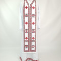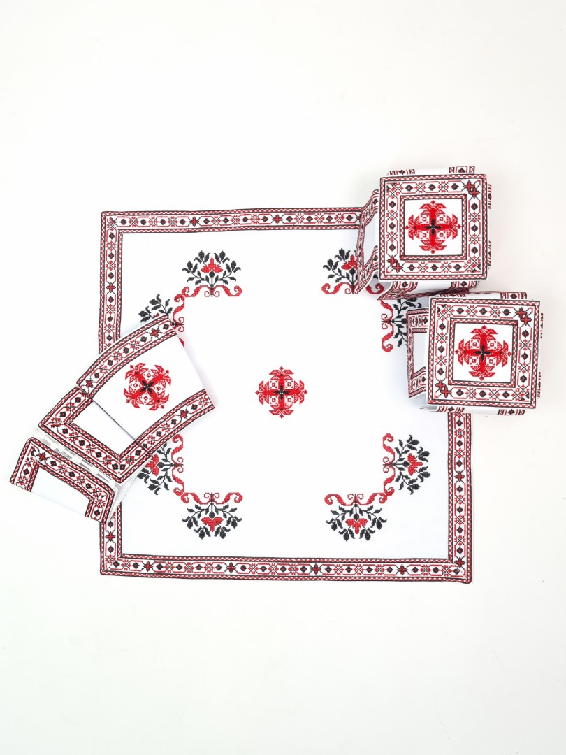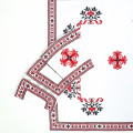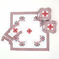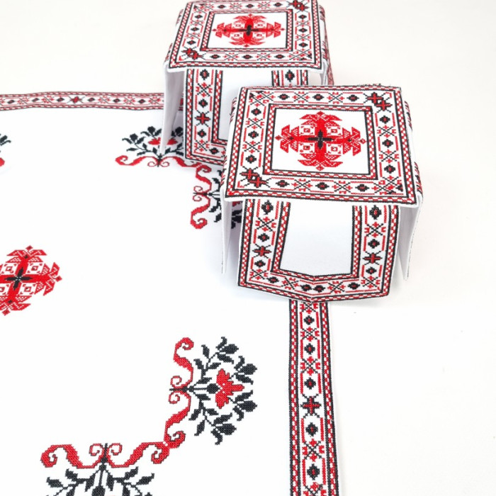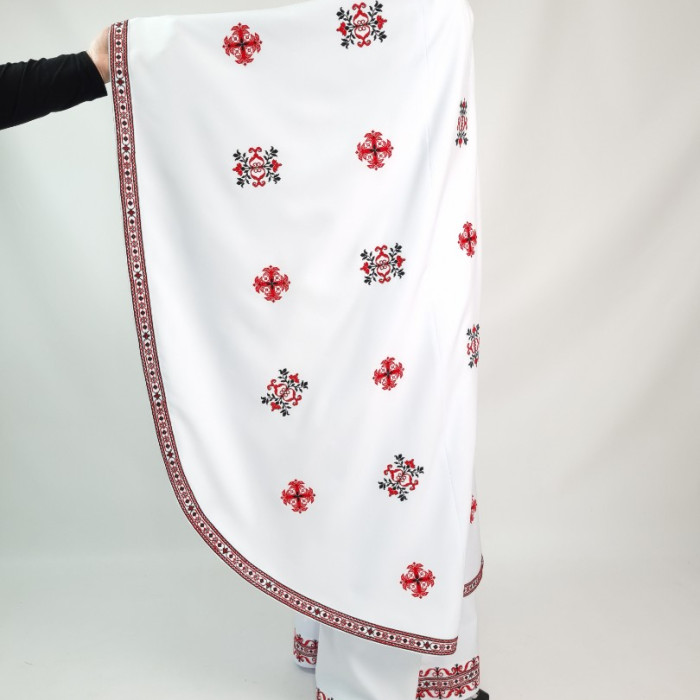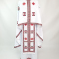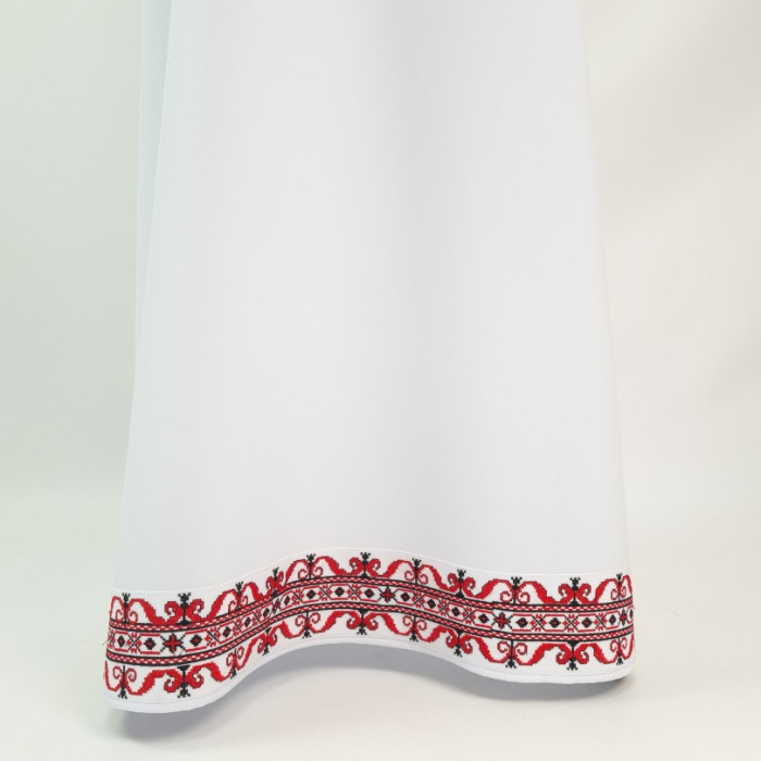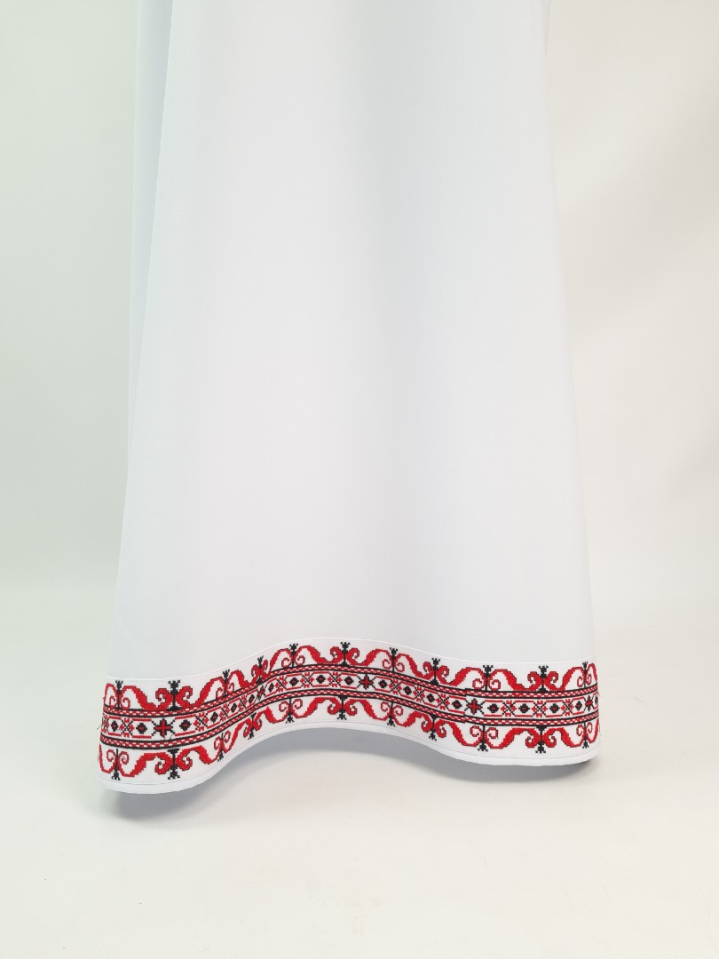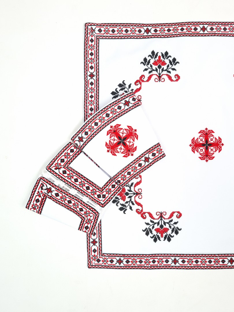 - Виріб пошито з габардину білосніжного відтінку, а машинна вишивка хрестиком виконана в червоно-чорних тонах.