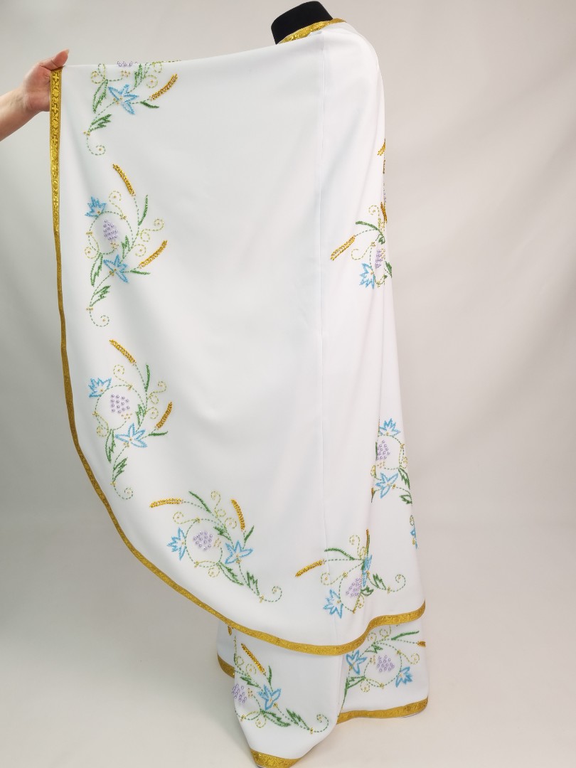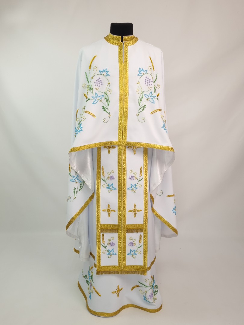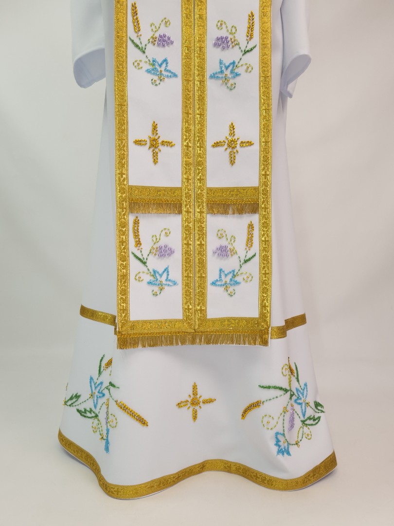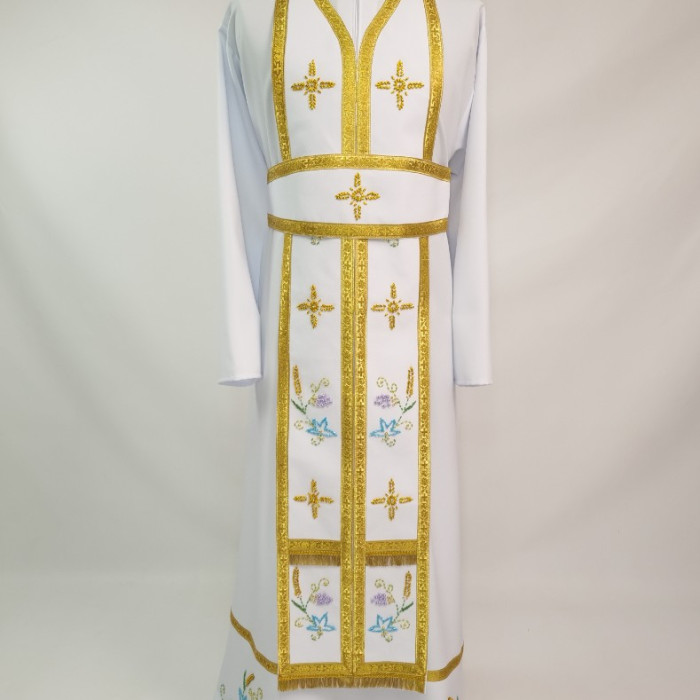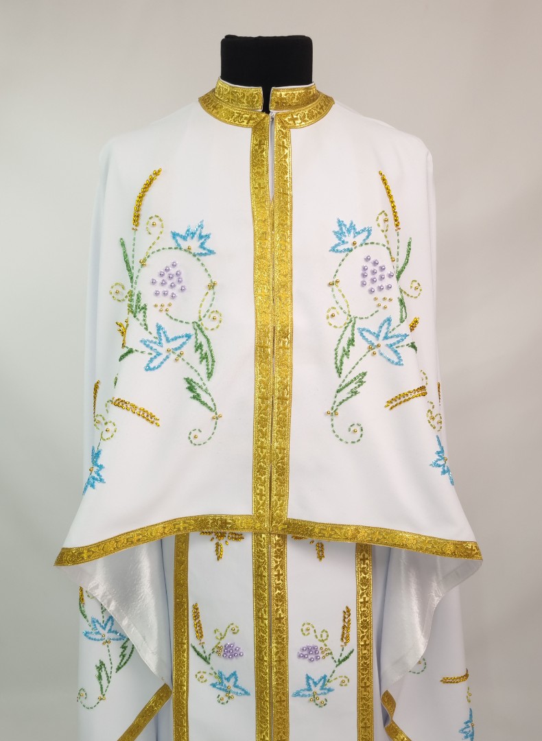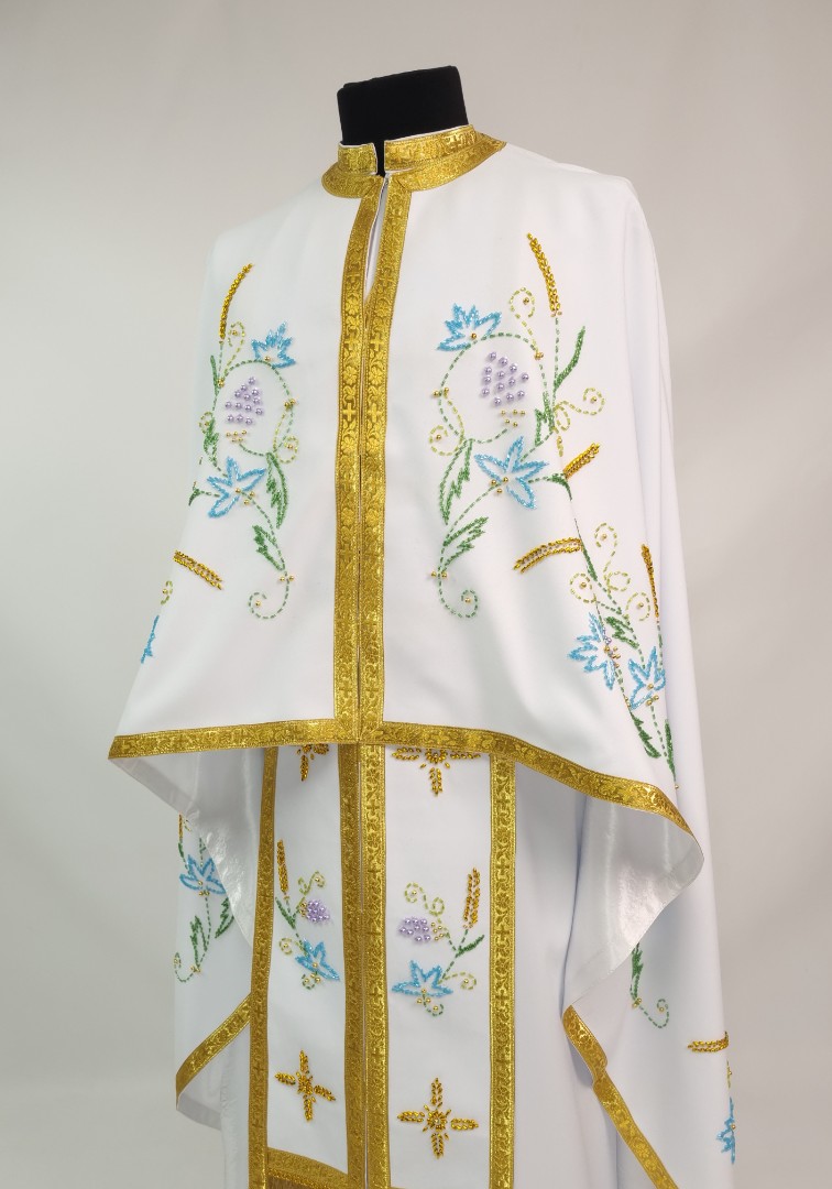- Вбрання для священика пошито з білого габардину і прикрашено кольоровим чеським бісером вручну.