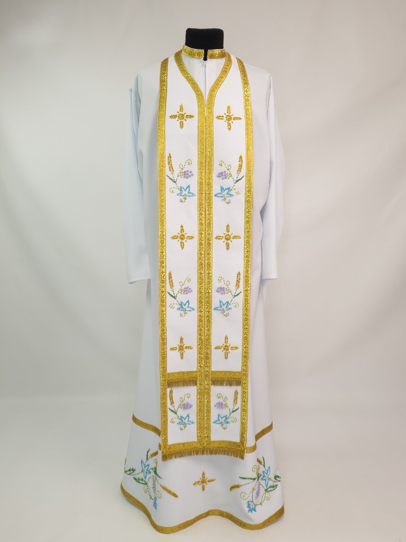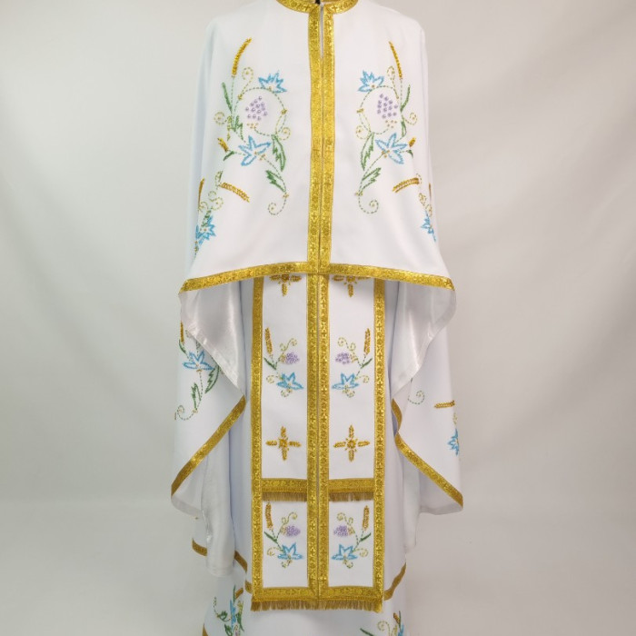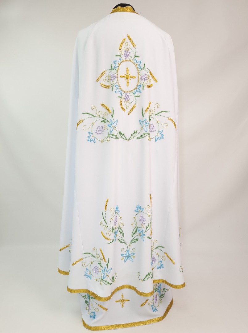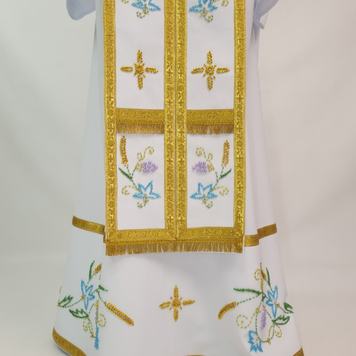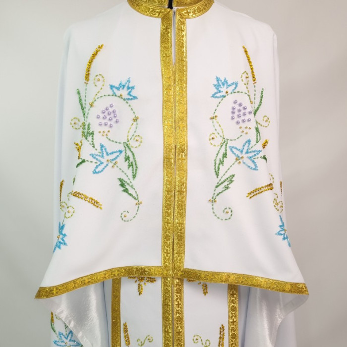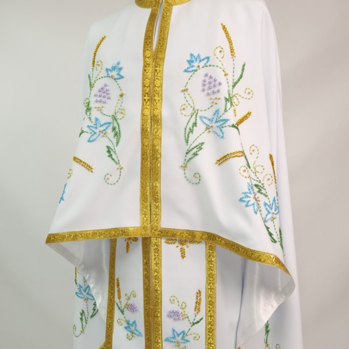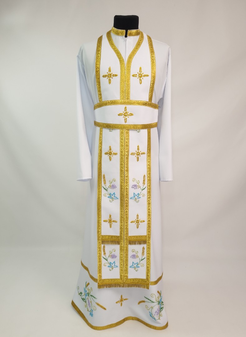 - Вбрання для священика пошито з білого габардину і прикрашено кольоровим чеським бісером вручну.