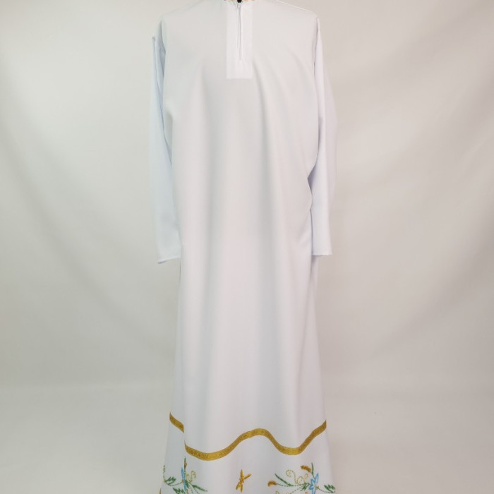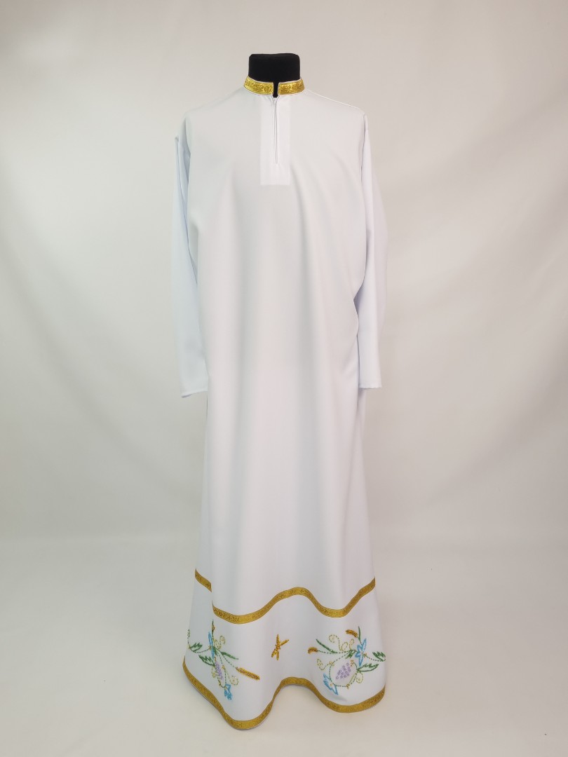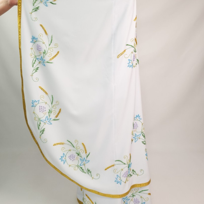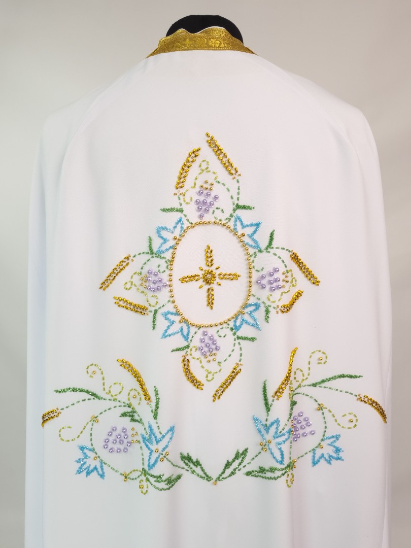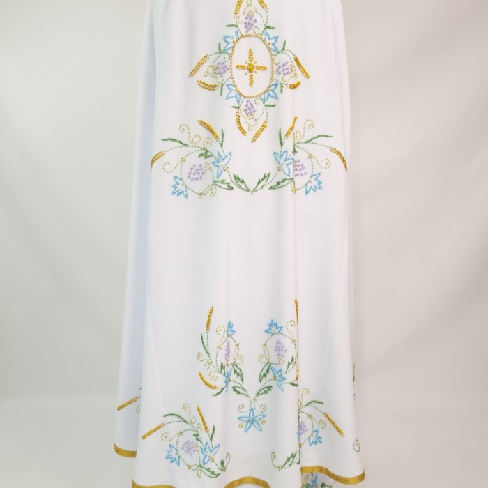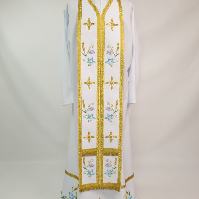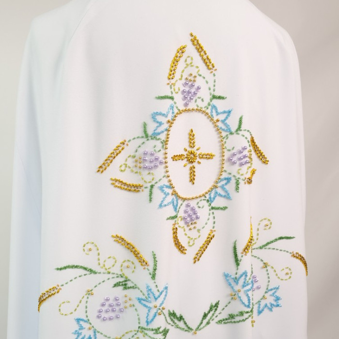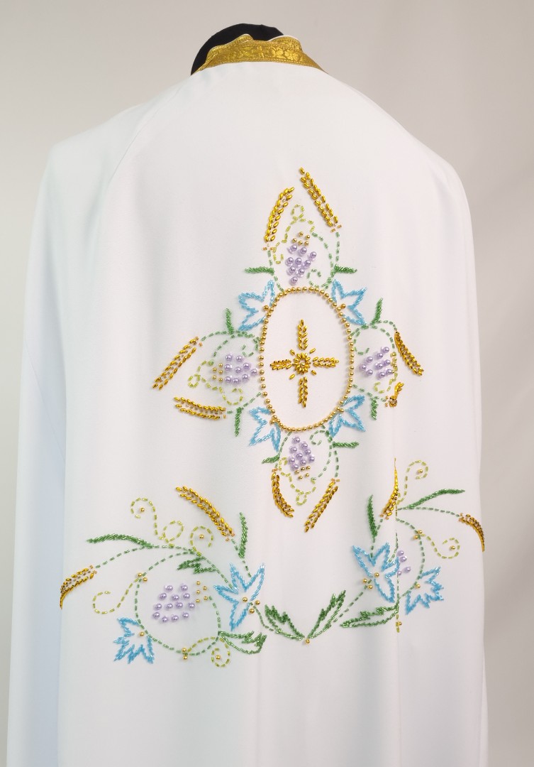 - Вбрання для священика пошито з білого габардину і прикрашено кольоровим чеським бісером вручну.