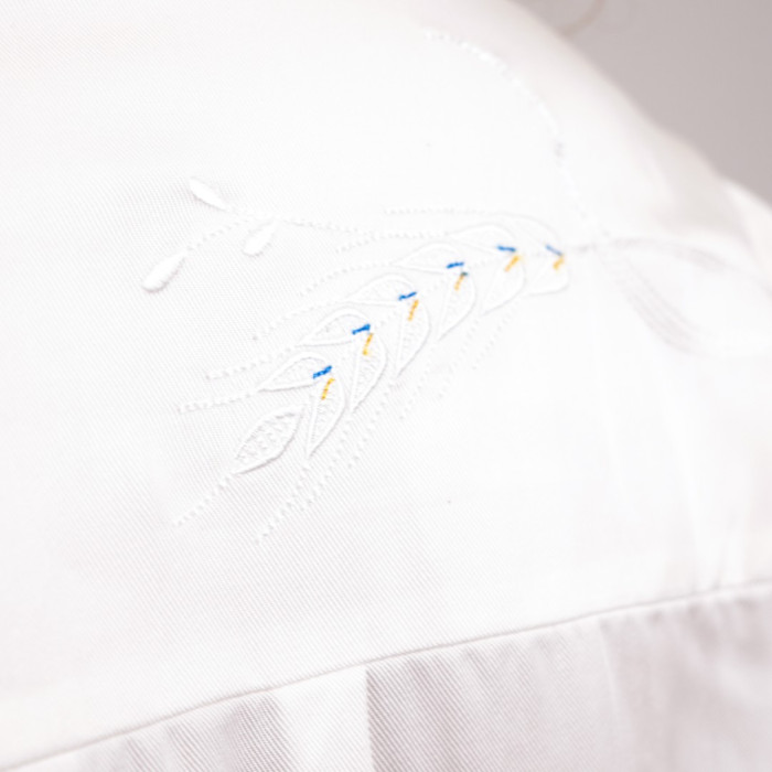 Елегантний дизайн: Вишивка розташована на одному рукаві, переходить на кокетку спини та завершується фрагментом колоска на комірці. Біле на білому виглядає надзвичайно ніжно, створюючи неперевершений ефект.
