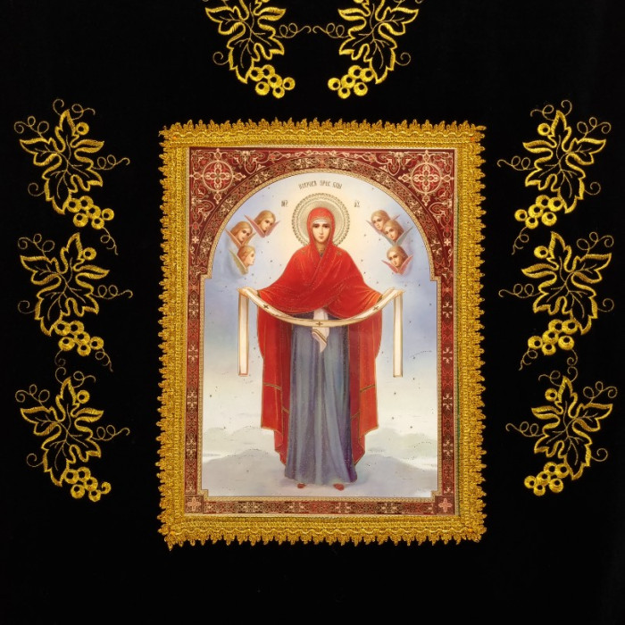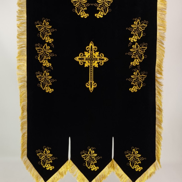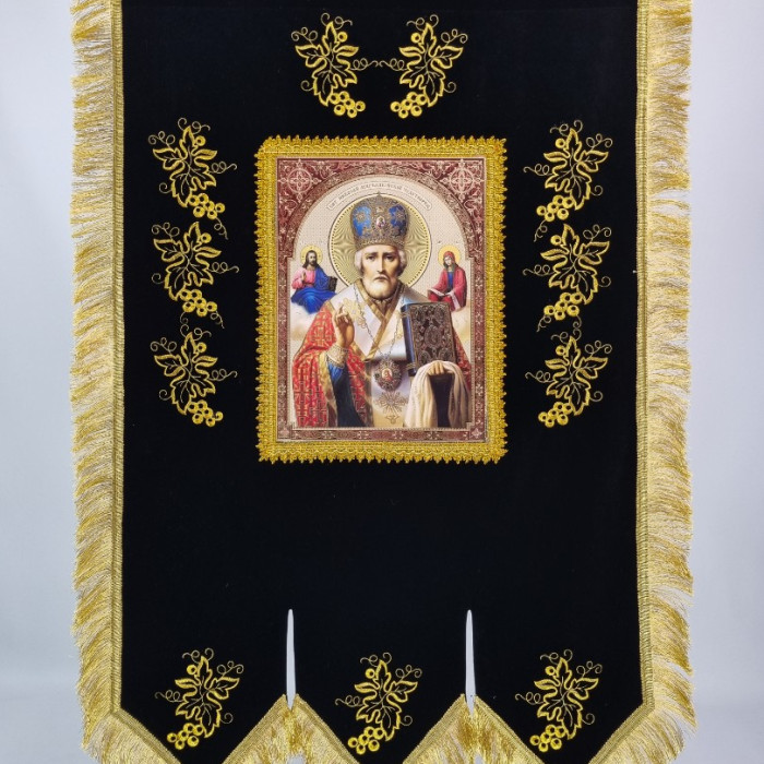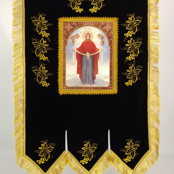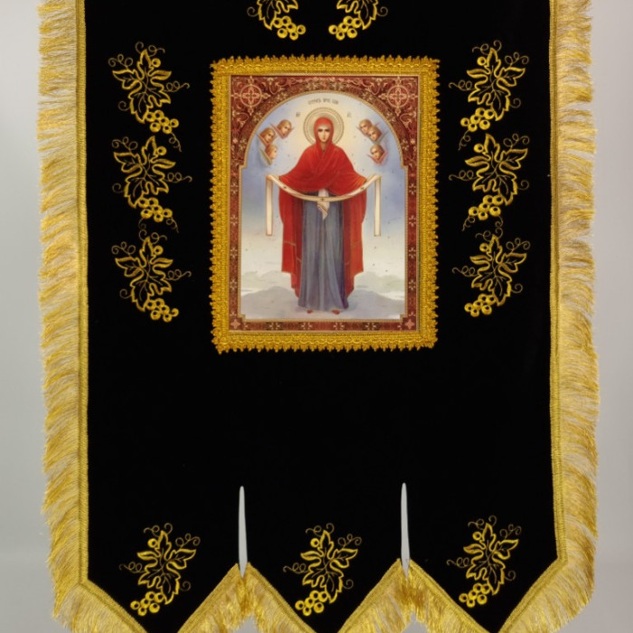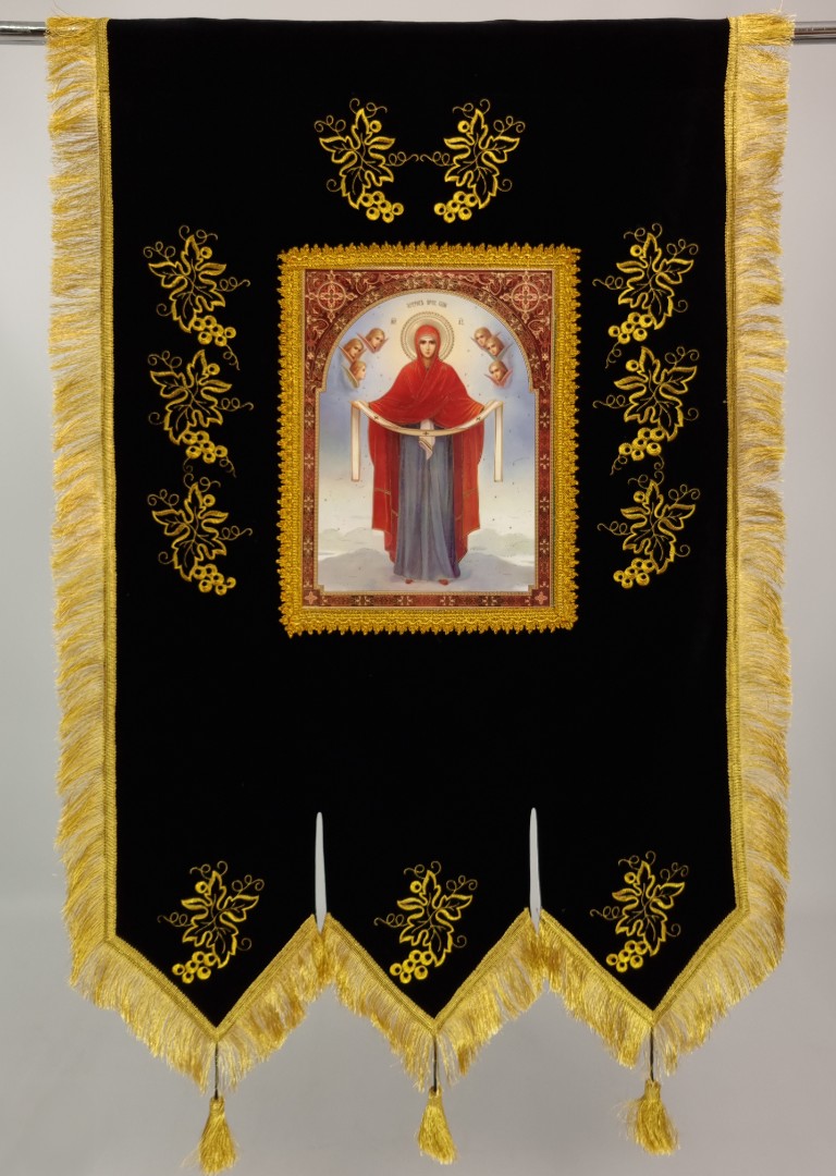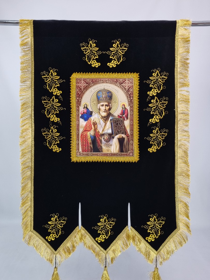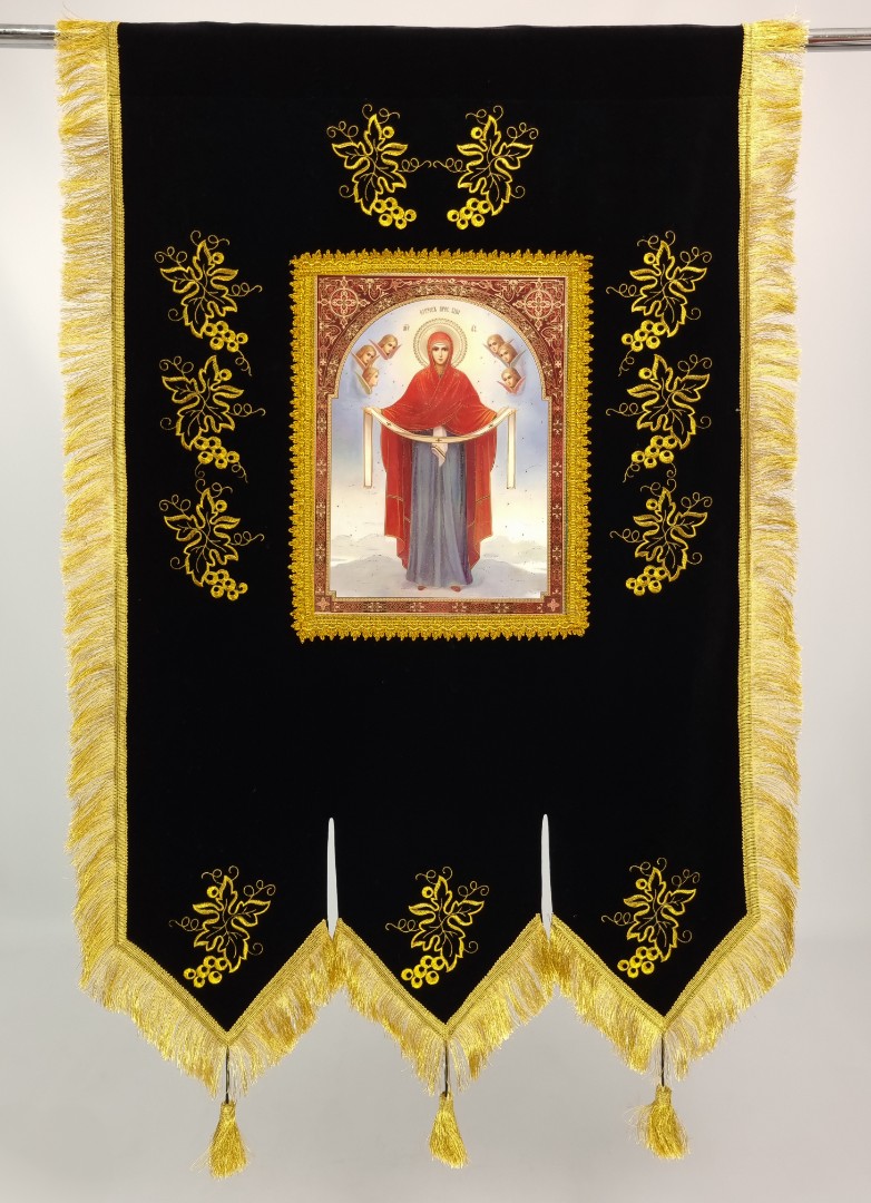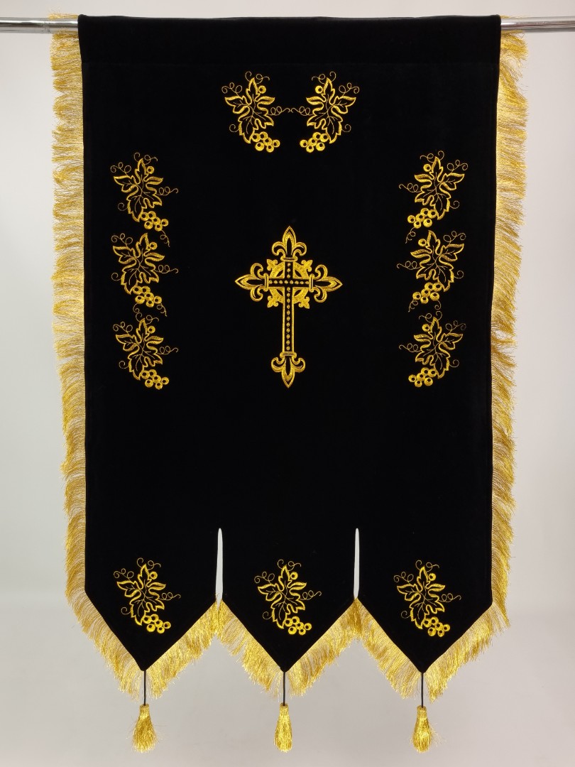 - Церковний прапор пошито з оксамиту насиченого чорного відтінку і має декор благородного золотого кольору.