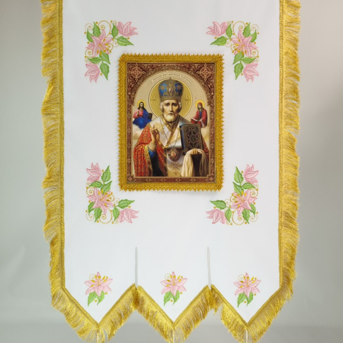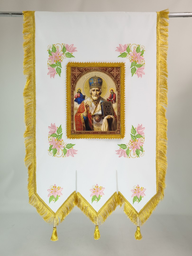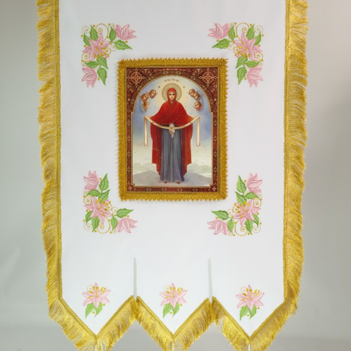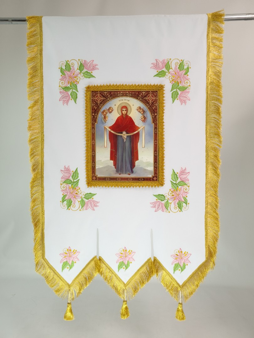 Купити вишиту хоругву з білосніжного габардину можна в нашому магазині в режимі он-лайн або по телефону.