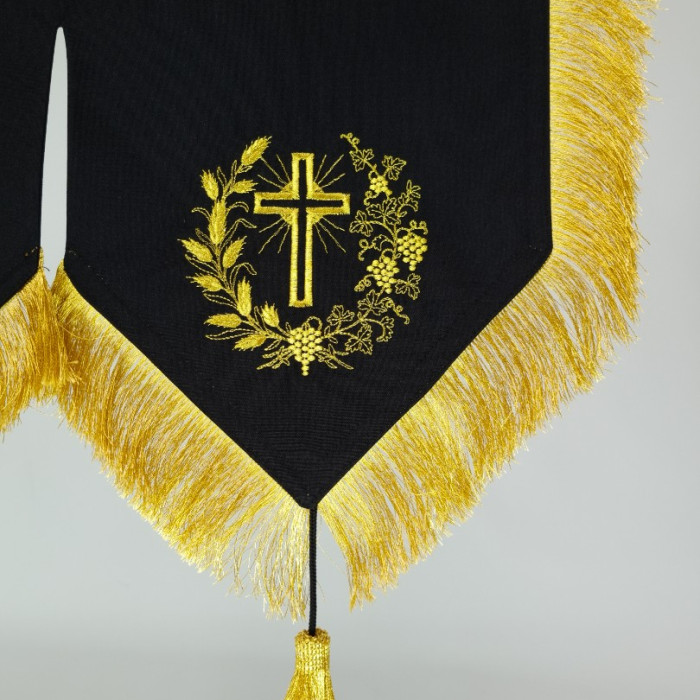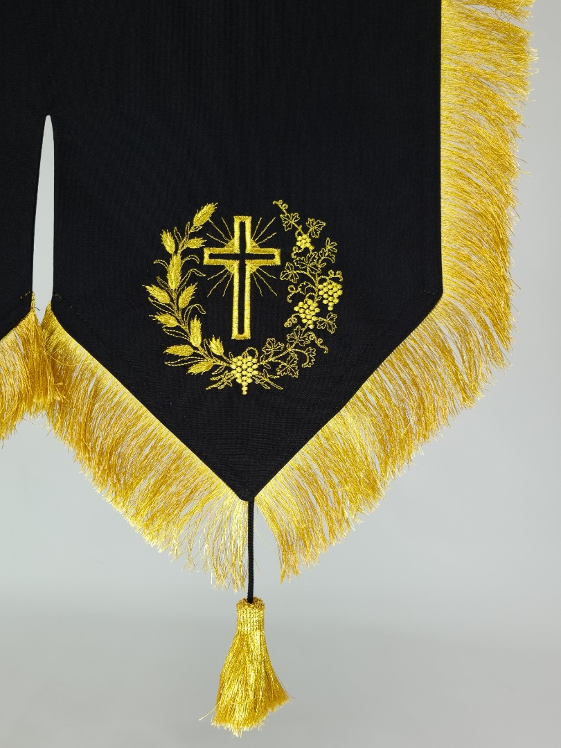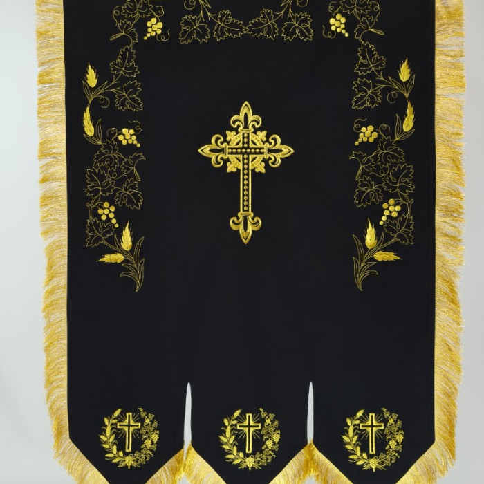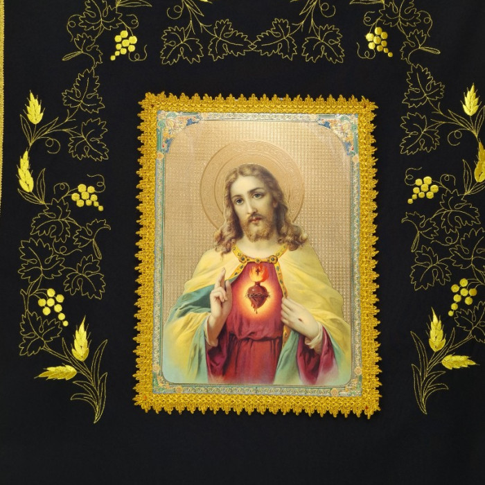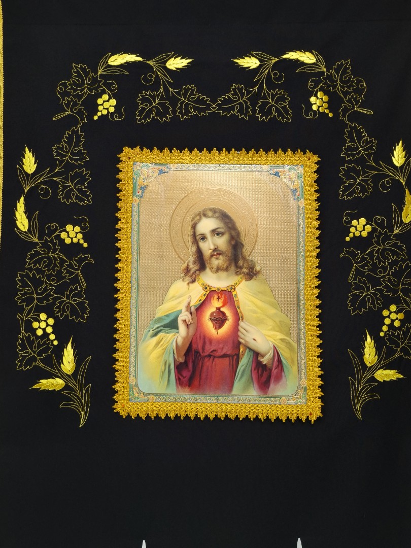 Розміри 75 см на 115 см. Вишивка з обох сторін, образи з одієї сторони, хрест з іншої.