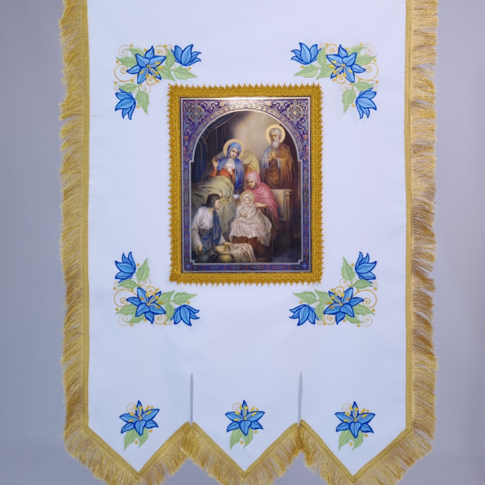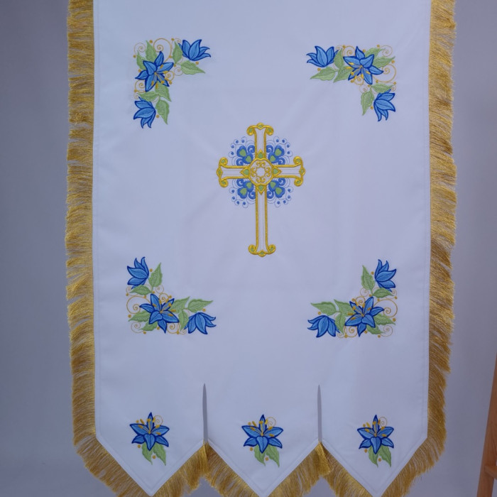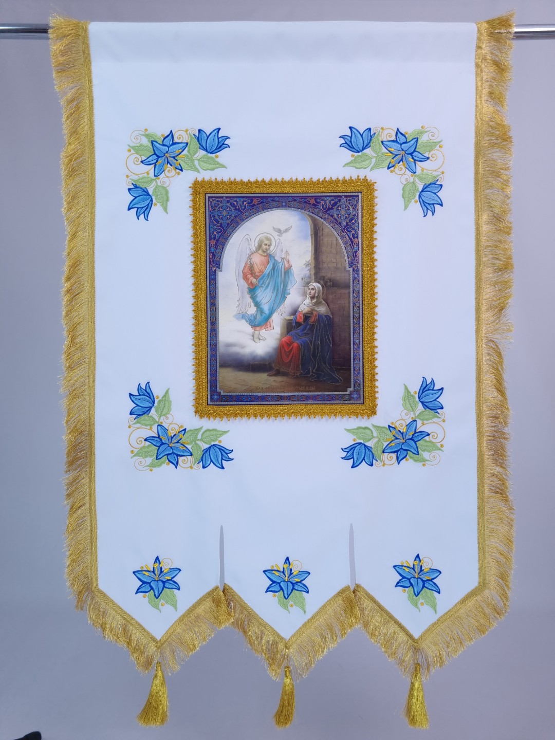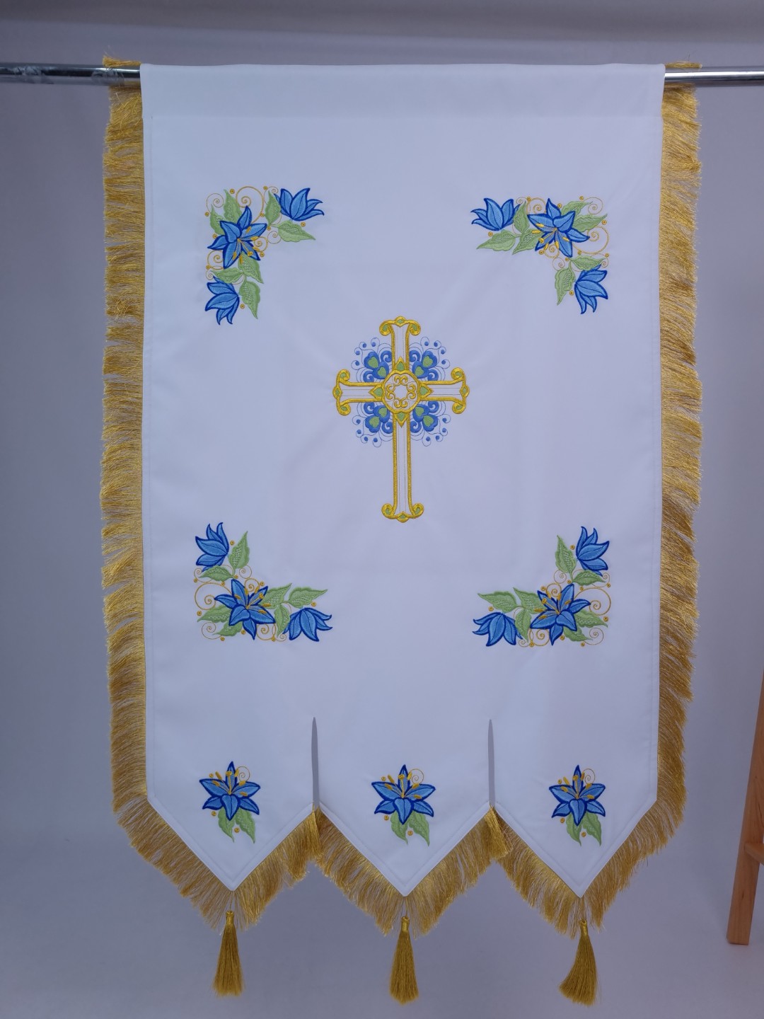 Купити вишиту хоругву з білосніжного габардину можна в нашому магазині в режимі он-лайн або по телефону.