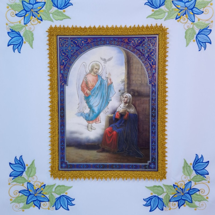 - Орнамент має вигляд композицій з блакитних лілій в обрамленні зеленого листя, по центру красується образ.