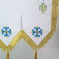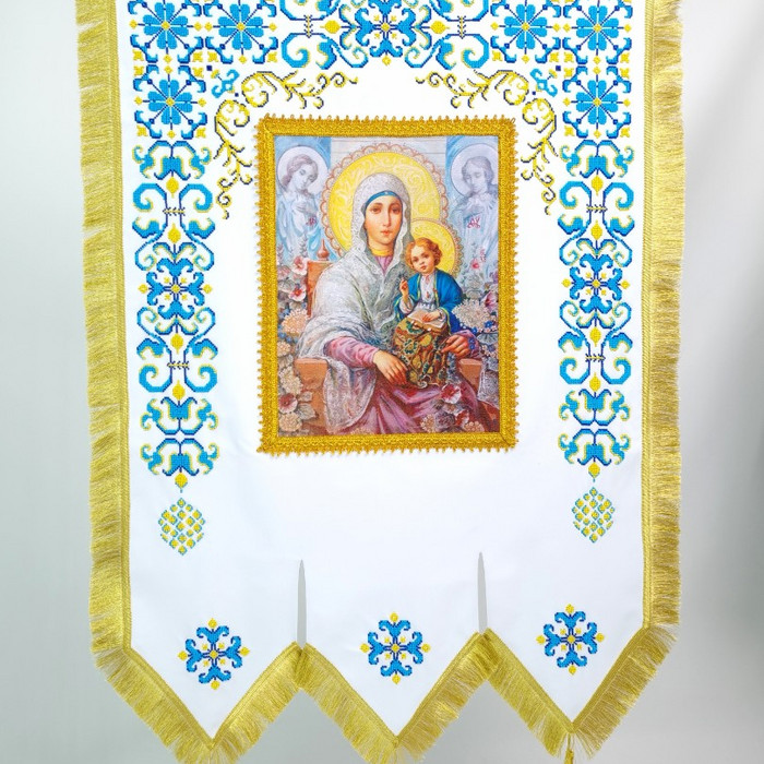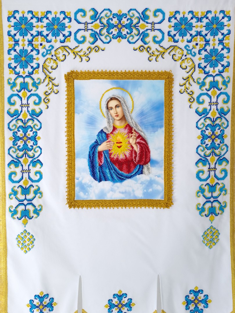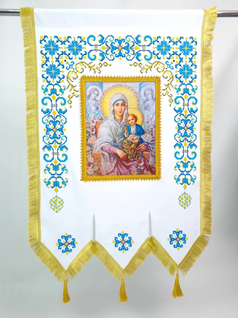 - Для оформлення хоругви використовувався якісний чеський бісер синіх і жовтих відтінків, всі роботи з вишивання велися вручну.