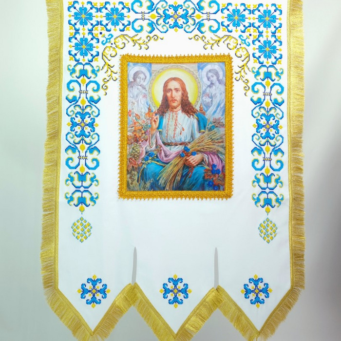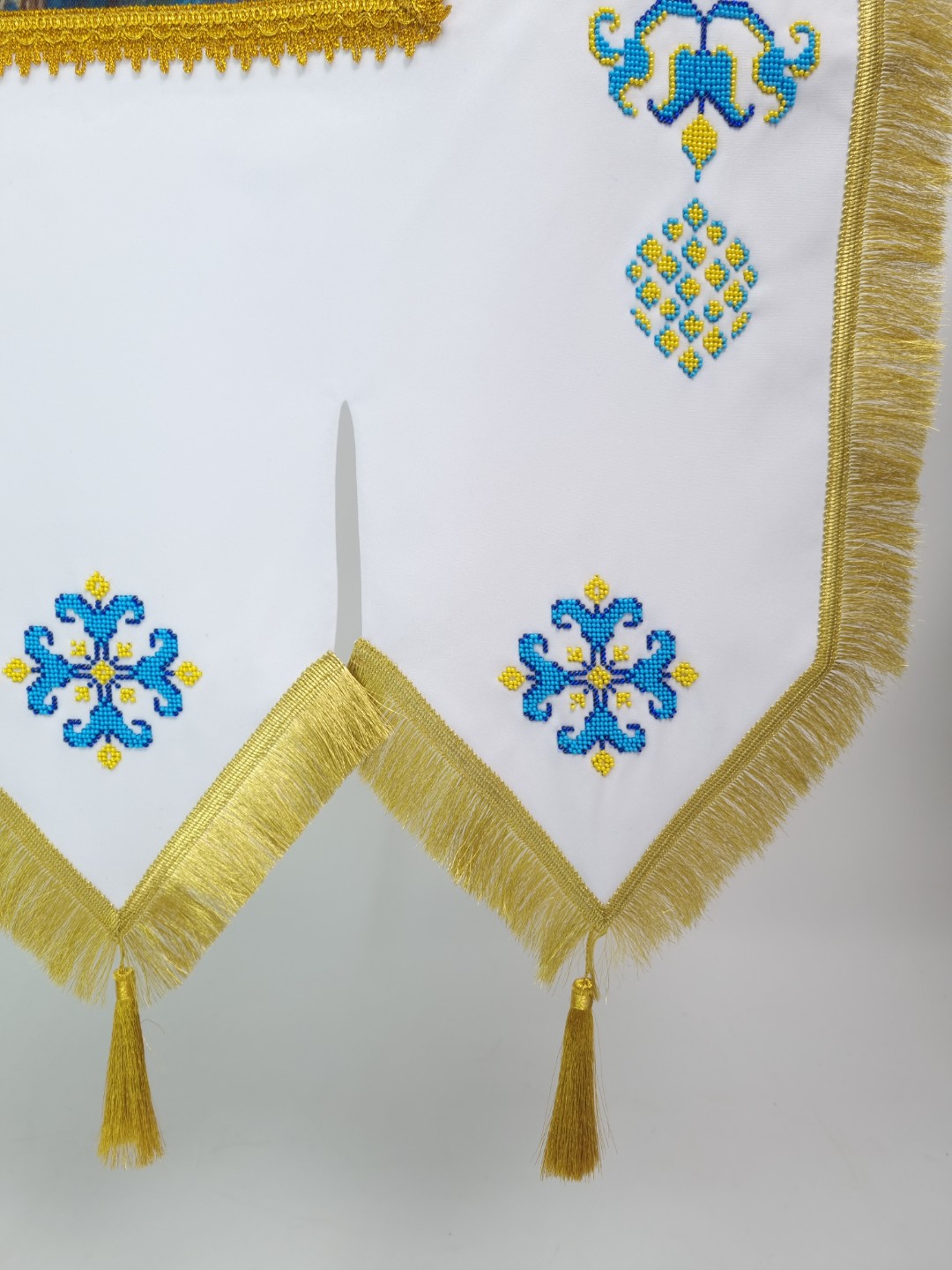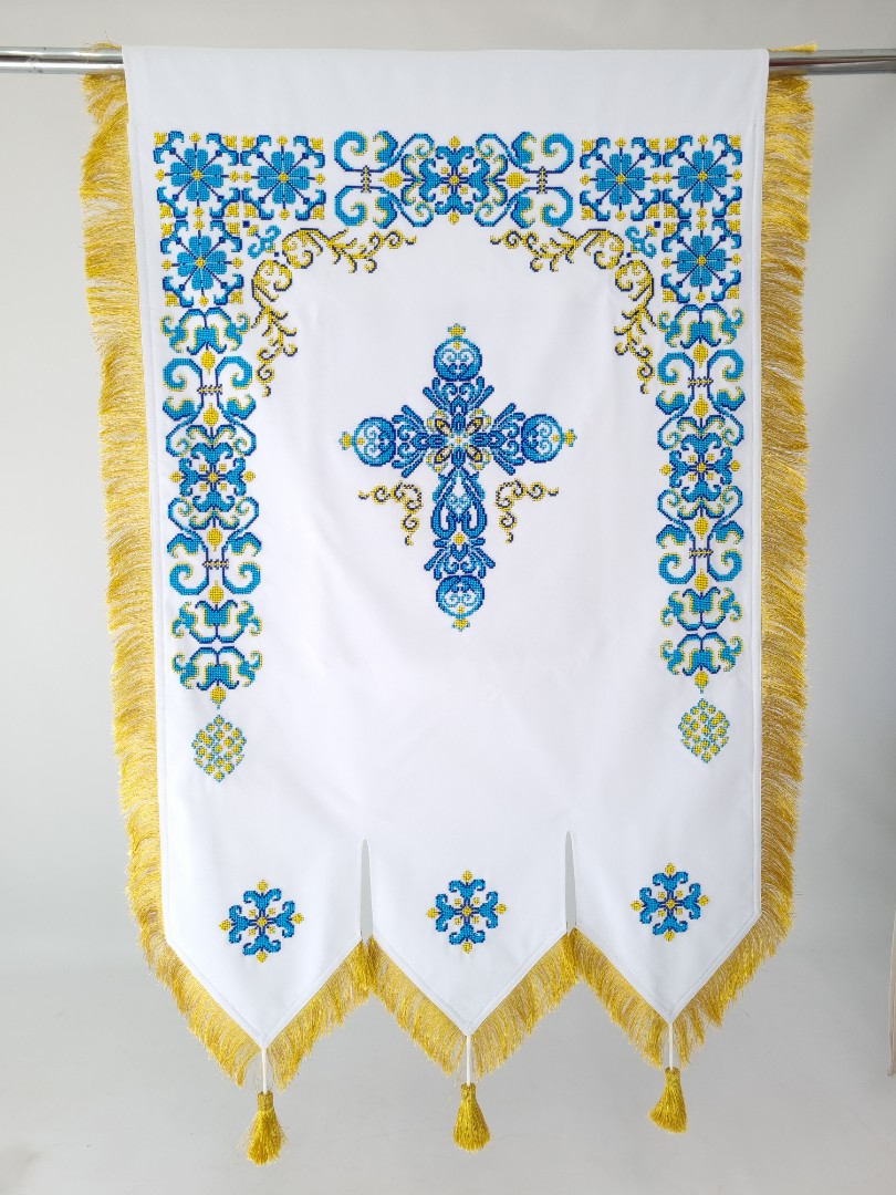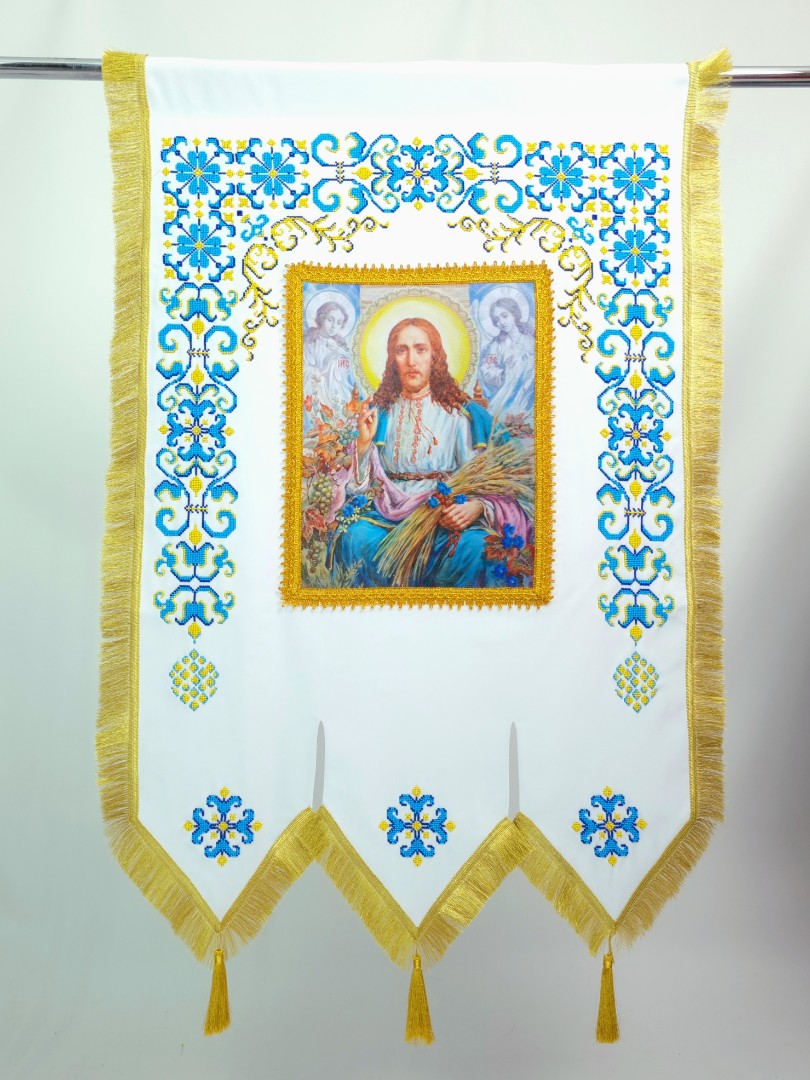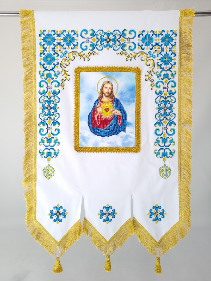 - Релігійний прапор пошито з міцного габардину білого кольору, обшитого з обох боків золотою бахромою.