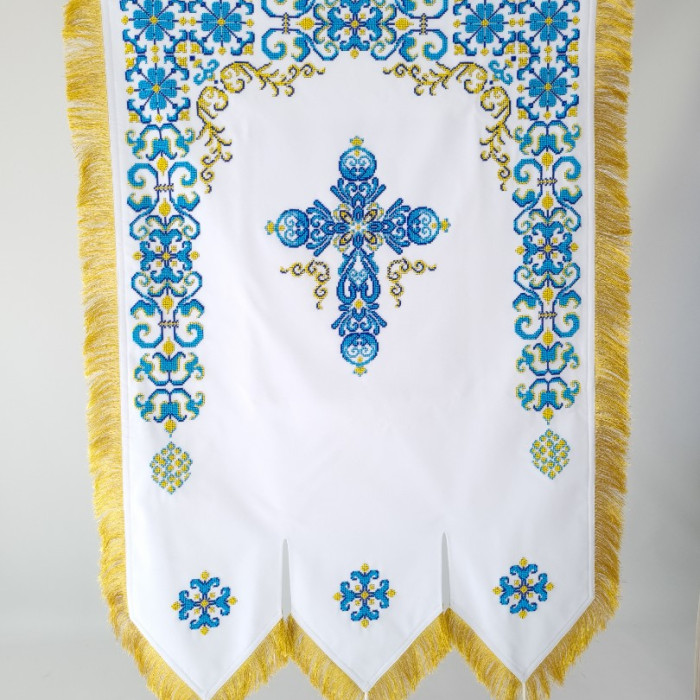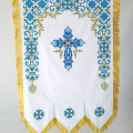 - По центру полотнища поміщена ікона, вишита бісером,(ікони можна змінювати по бажанню) з одного боку, з іншого - вишитий великий хрест; навколо розташовується рослинно-геометричний орнамент, на трьох кінцях зображені стилізовані під квіти хрестики.